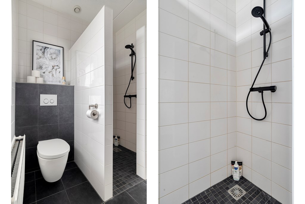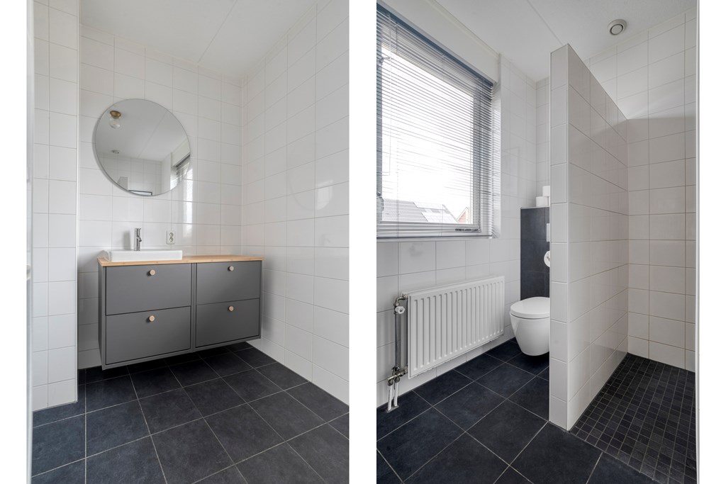 Vanaf de overloop zijn drie slaapkamers bereikbaar. De moderne badkamer beschikt over een inloopdouche, een wastafelmeubel (2025) en een tweede toilet.
