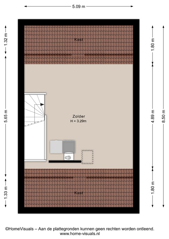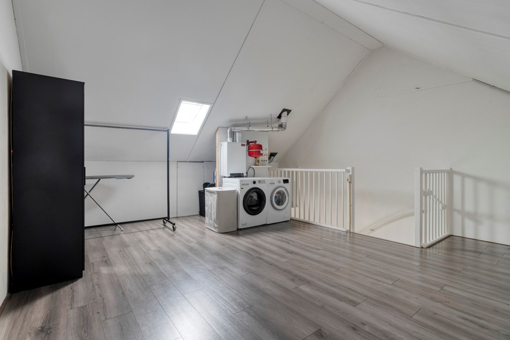 Via een vaste trap bereik je de ruime zolder met cv-installatie en witgoedaansluitingen. Deze verdieping biedt voldoende plek voor bijvoorbeeld een extra (slaap)kamer of thuiswerkplek.