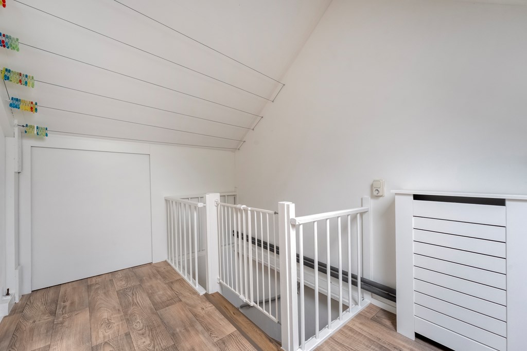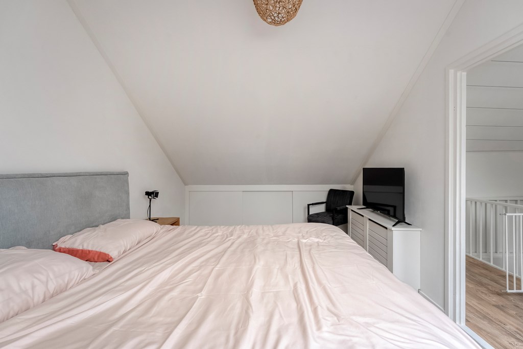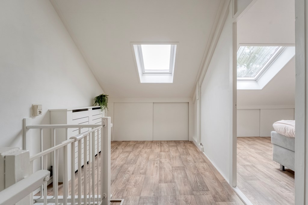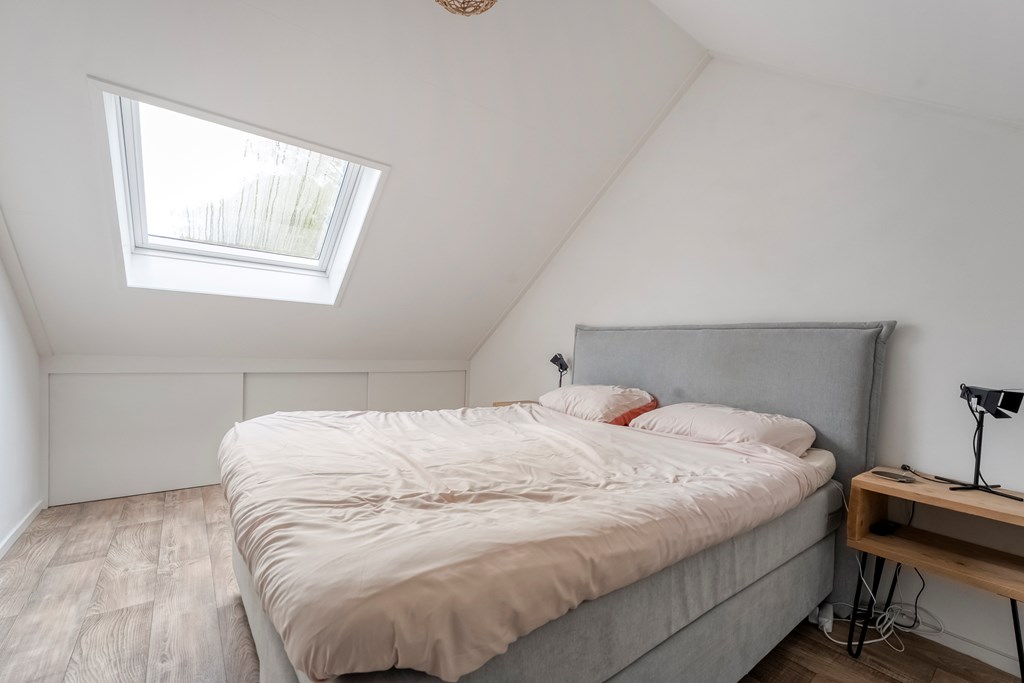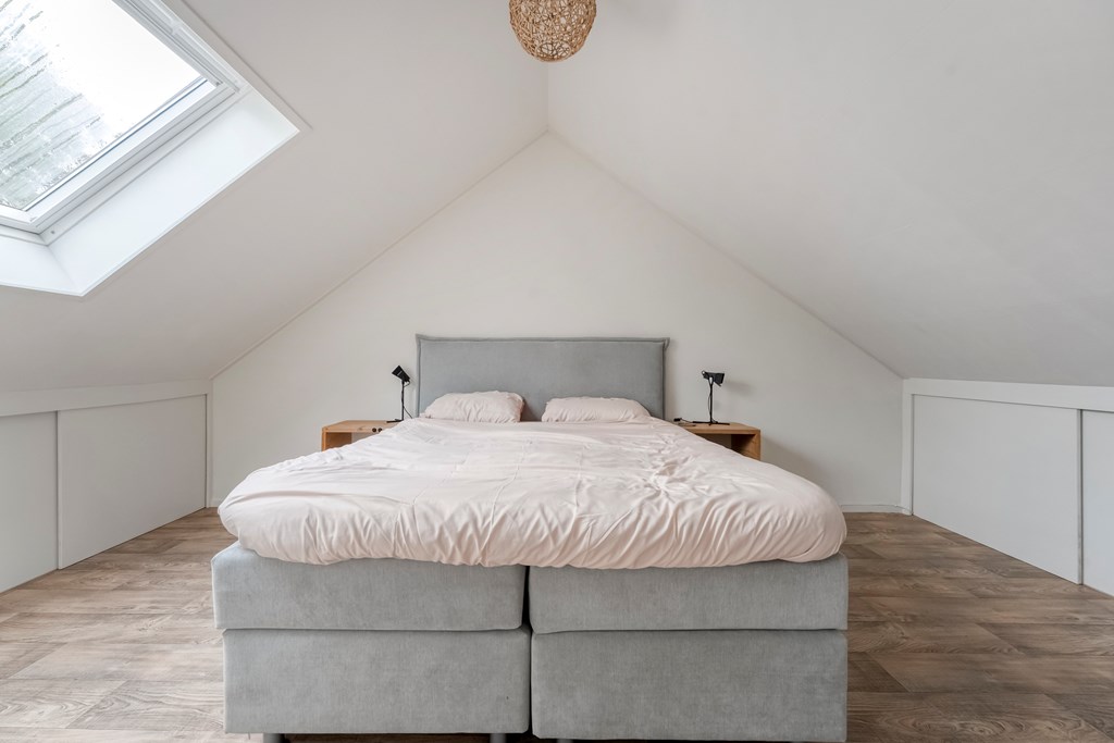 De zolder is bereikbaar via een vaste trap. Deze verdieping is keurig afgewerkt en biedt een ruime vierde slaapkamer. Achter de knieschotten is bovendien extra bergruimte, altijd handig voor de spullen die je niet dagelijks nodig hebt.