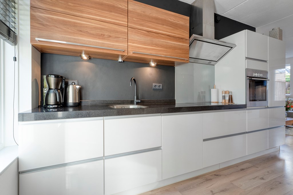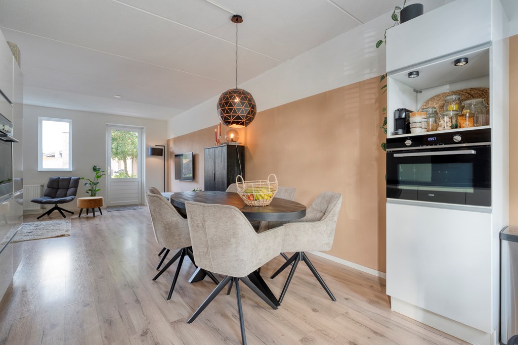 Er is voldoende parkeergelegenheid voor de deur. Entree/hal met meterkast en toiletruimte (zwevend toilet met fontein). Vanuit de hal toegang tot de trapkast en de ruime woonkamer. De open keuken bevindt zich aan de straatzijde en is voorzien van veel bergruimte met lades en diverse inbouwapparatuur, waaronder een vaatwasser (2024), aparte oven, combimagnetron (2021) en inductiekookplaat. De gehele verdieping is afgewerkt met een laminaatvloer. Via de achterdeur is de tuin op het zuid-westen bereikbaar.