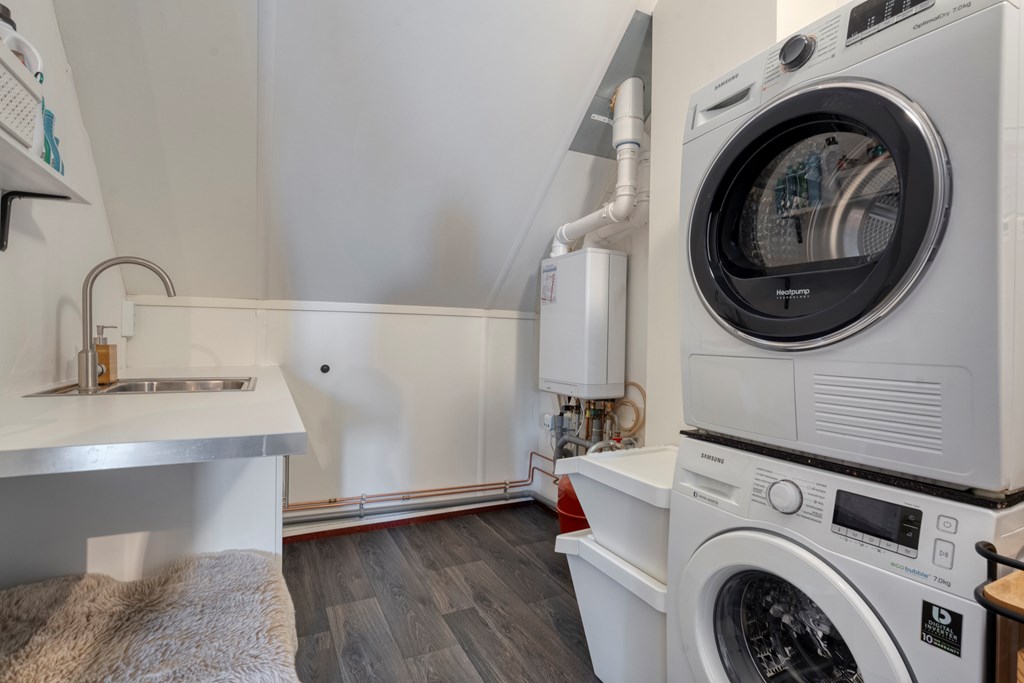 Riante overloop met aparte CV/wasruimte waar tevens een keukenblok met koud/warm water aanwezig is. En daarnaast nog twee ruime slaapkamers van 11 m² en 15 m².