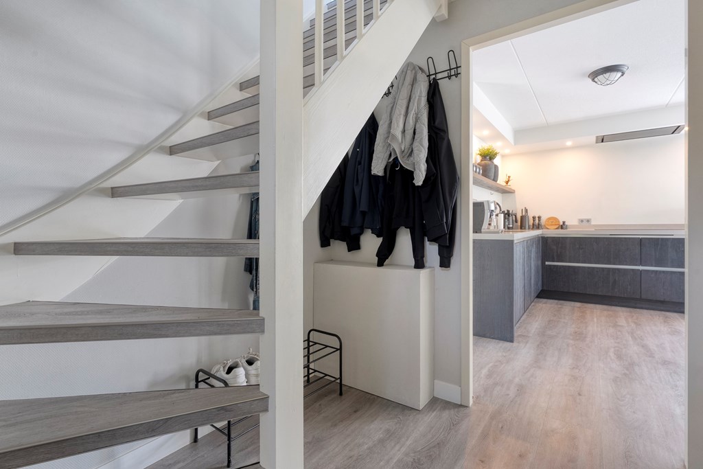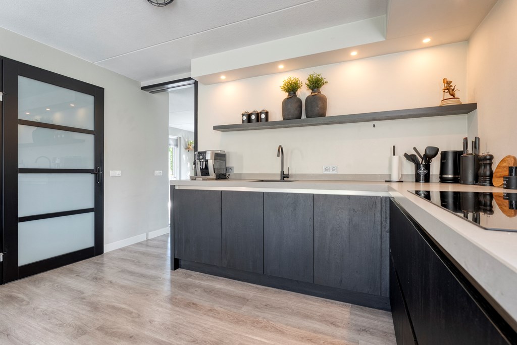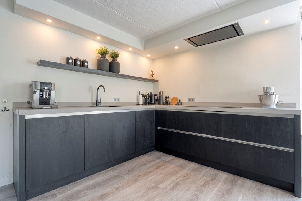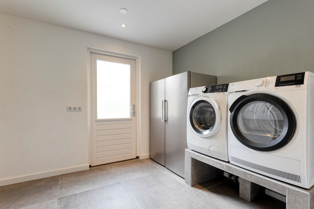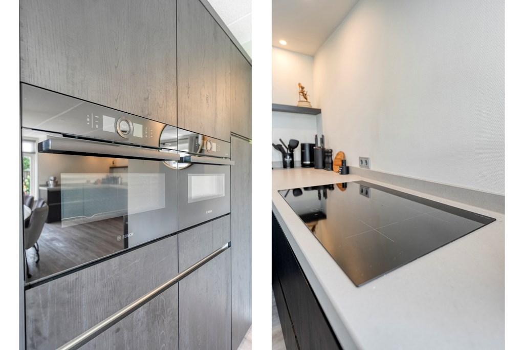 Via de overdekte entree kom je binnen in de hal, waar je de meterkast, het moderne hangtoilet en de trapopgang vindt. De royale, lichte woonkamer kijkt prachtig uit over het water en staat in open verbinding met de luxe keuken met airco. Deze is compleet ingericht met inbouwapparatuur van Bosch, waaronder een koelkast, vaatwasser, inductiekookplaat, oven, combi-oven én stoomoven. Dankzij de openslaande deuren loop je zo de achtertuin in, waar een fijn terras op je wacht. Direct naast de keuken bevindt zich de praktische berging met wasbak en aansluitingen voor zowel wasmachine als droger. Voor de woning ligt een brede oprit met ruimte om twee auto’s naast elkaar te parkeren. Daarnaast is er toegang tot zowel de garage als de woning zelf. De begane grond is volledig voorzien van vloerverwarming, wat zorgt voor optimaal comfort in alle ruimtes.