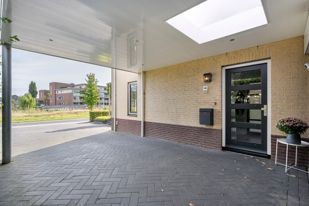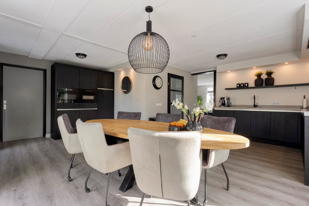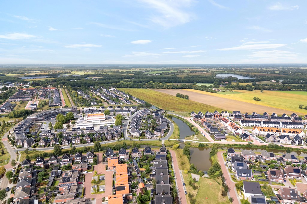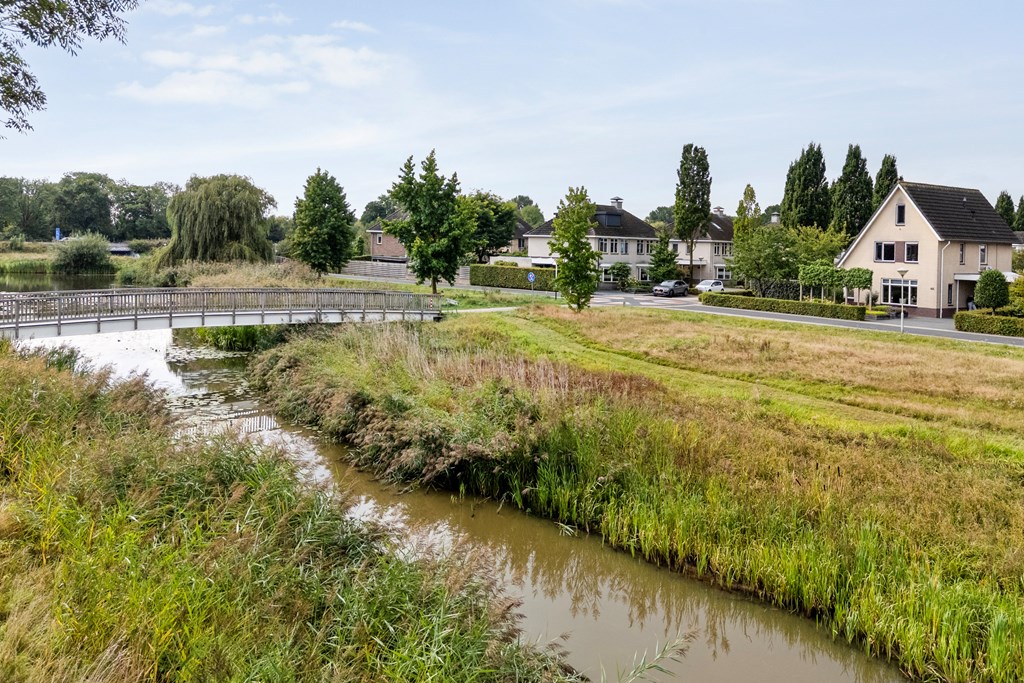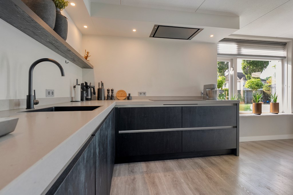 Via de overdekte entree kom je binnen in de hal, waar je de meterkast, het moderne hangtoilet en de trapopgang vindt. De royale, lichte woonkamer kijkt prachtig uit over het water en staat in open verbinding met de luxe keuken met airco. Deze is compleet ingericht met inbouwapparatuur van Bosch, waaronder een koelkast, vaatwasser, inductiekookplaat, oven, combi-oven én stoomoven. Dankzij de openslaande deuren loop je zo de achtertuin in, waar een fijn terras op je wacht. Direct naast de keuken bevindt zich de praktische berging met wasbak en aansluitingen voor zowel wasmachine als droger. Voor de woning ligt een brede oprit met ruimte om twee auto’s naast elkaar te parkeren. Daarnaast is er toegang tot zowel de garage als de woning zelf. De begane grond is volledig voorzien van vloerverwarming, wat zorgt voor optimaal comfort in alle ruimtes.