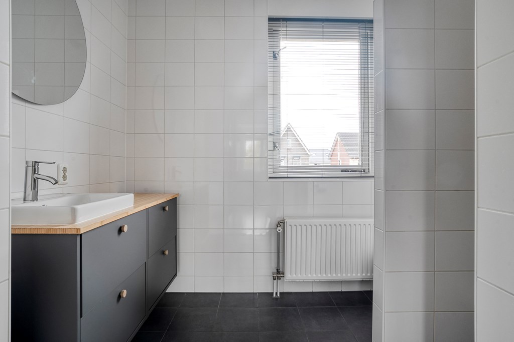 Vanaf de overloop zijn drie slaapkamers bereikbaar. De moderne badkamer beschikt over een inloopdouche, een wastafelmeubel (2025) en een tweede toilet.
