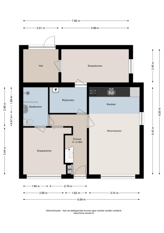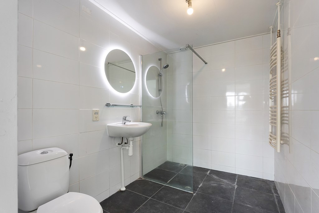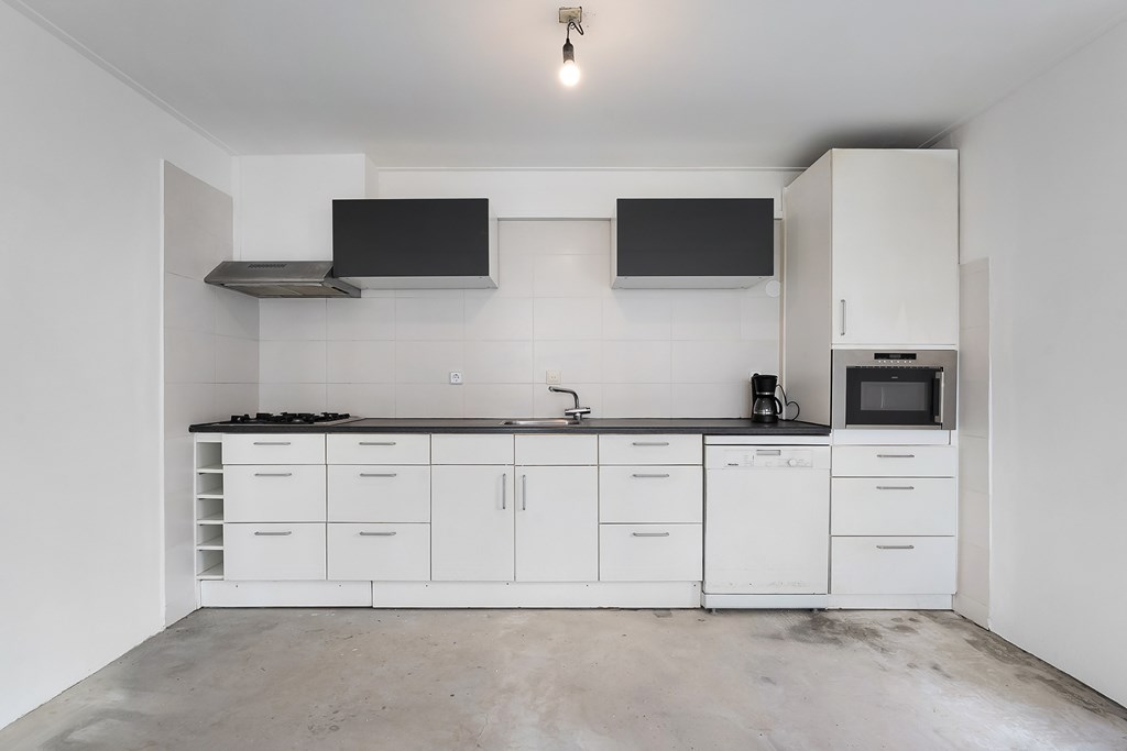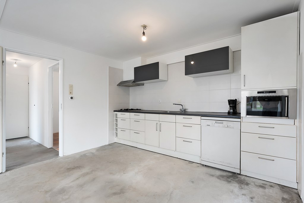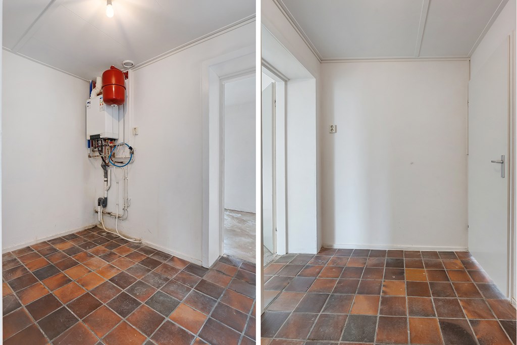 Binnenkomst via de entree met meterkast, met toegang tot de woonkamer, keuken, slaapkamer, bijkeuken, badkamer met inloopdouche, toilet en wastafel. De keuken is voorzien van een combimagnetron, gaskookplaat, afzuigkap en vaatwasser. Via de bijkeuken, waar ook de cv-ketel is geplaatst, loopt u door naar de slaapkamer en vervolgens naar de hal met een achteruitgang voor alleen noodsituaties.
