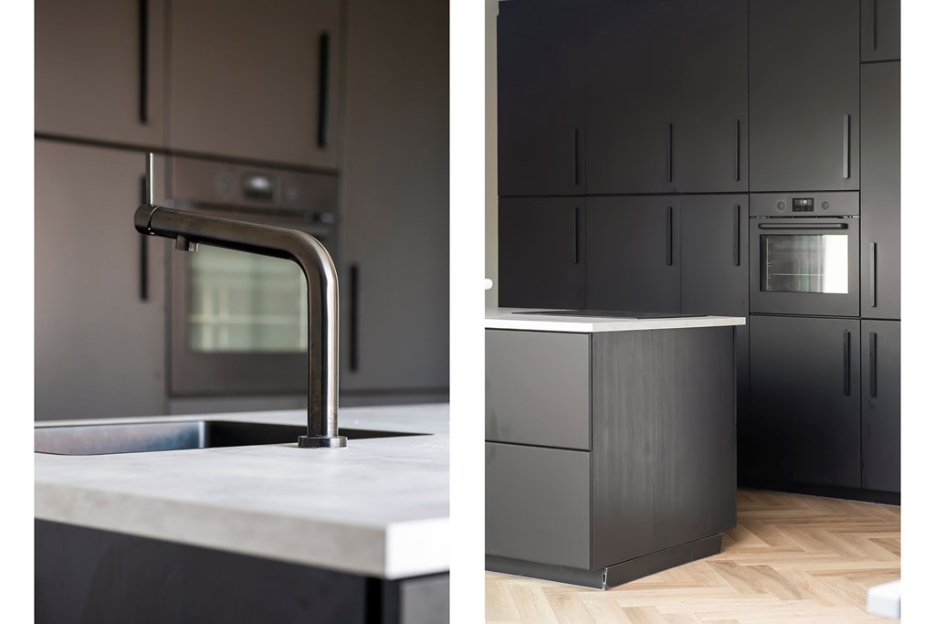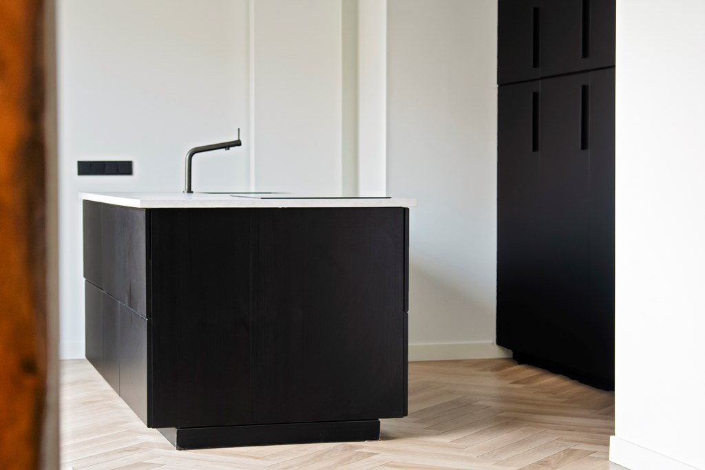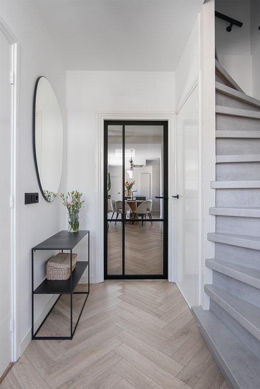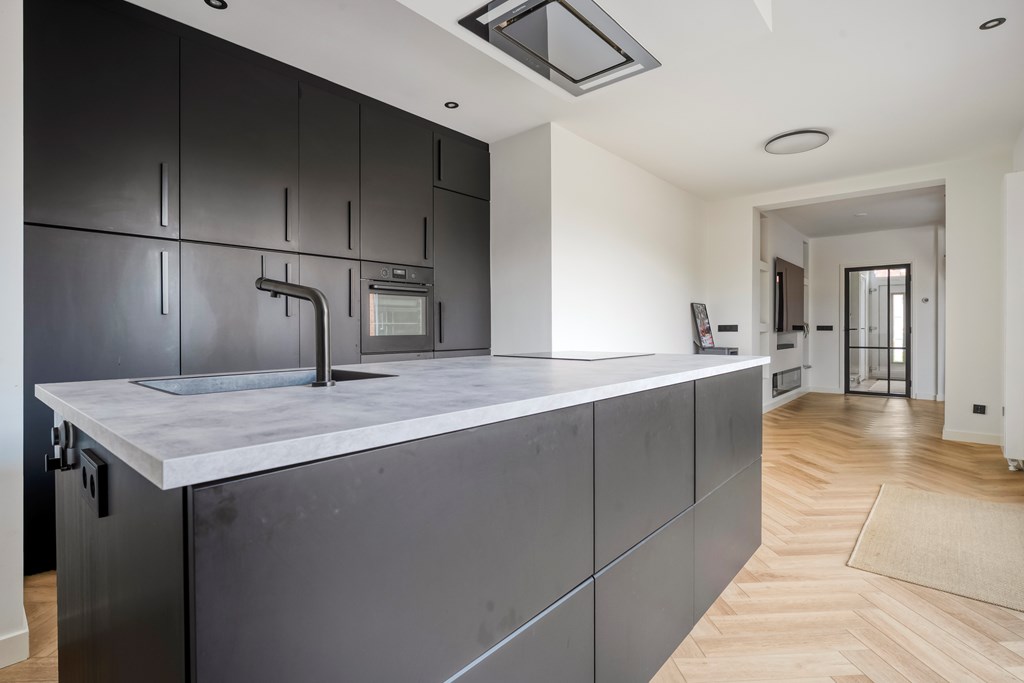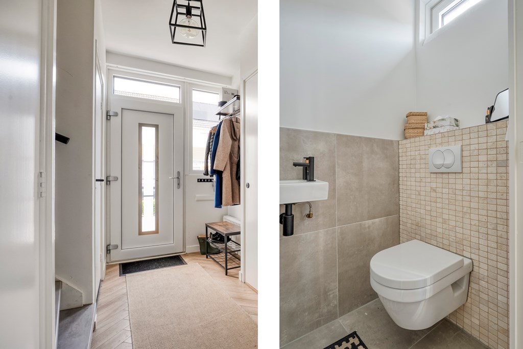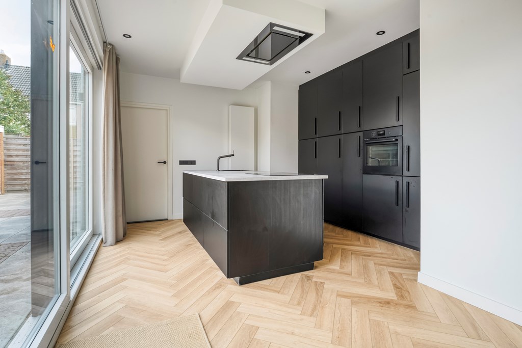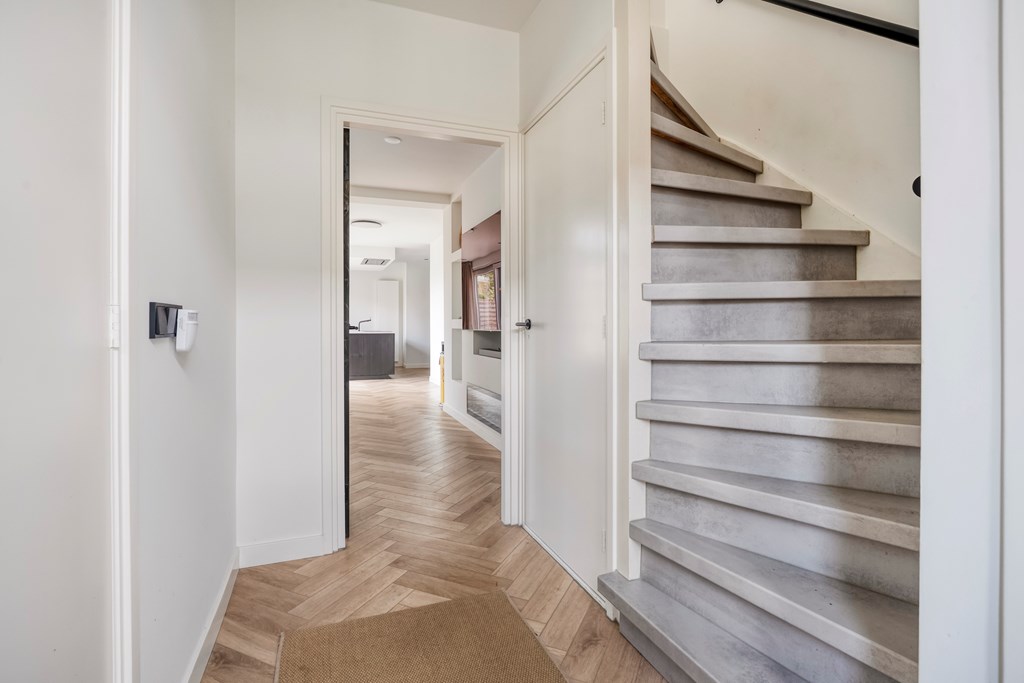 Begane grond: Entree/hal met meterkast, toilet en trapopgang met trapkast. Via de stoere zwarte glazen deur kom je in de lichte woonkamer met sfeervolle sierhaard. Aan de achterzijde ligt de open keuken met kookeiland en grote schuifpui naar de tuin. Achter de keuken bevindt zich de praktische bijkeuken met wasmachineaansluiting en achteringang. De keuken (2021) is uitgerust met een vaatwasser, koel-/vriescombinatie, inductie kookplaat en heteluchtoven.