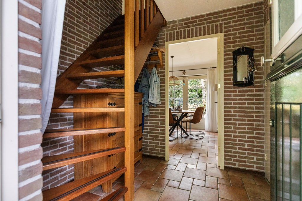Entree met hal, meterkast en toiletruimte. Vanuit de hal stap je de ruime, lichte woonkamer binnen met openslaande deuren naar het terras. De keuken bevindt zich aan de achterzijde van de woning en is uitgevoerd in een praktische hoekopstelling. Deze is uitgerust met een koelkast, vaatwasser, combimagnetron, gaskookplaat met afzuigkap. Ook is er via de keuken toegang tot de bijkeuken met aansluitingen voor witgoed. De begane grond is volledig voorzien van vloerverwarming, wat zorgt voor extra comfort.