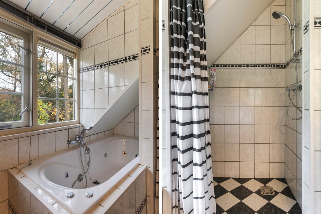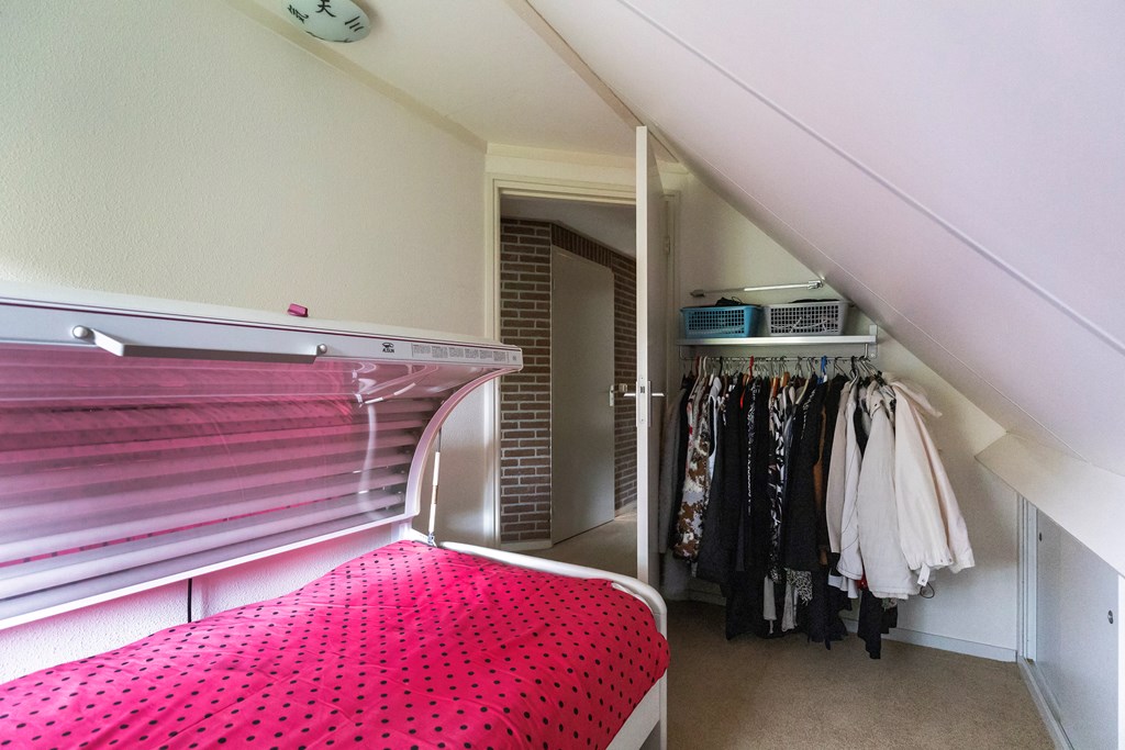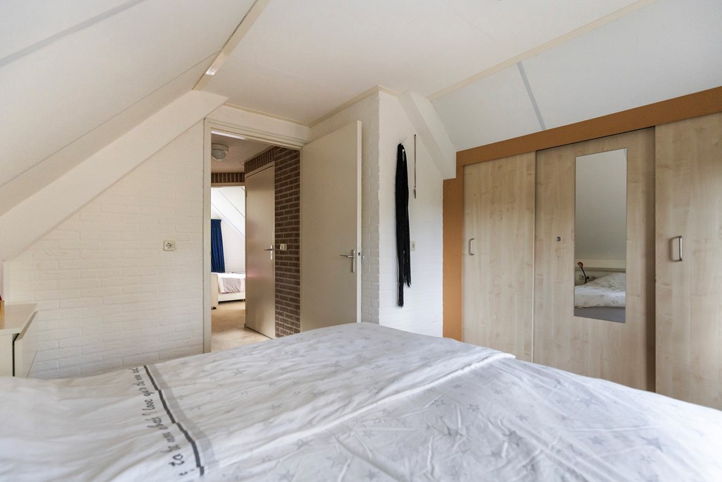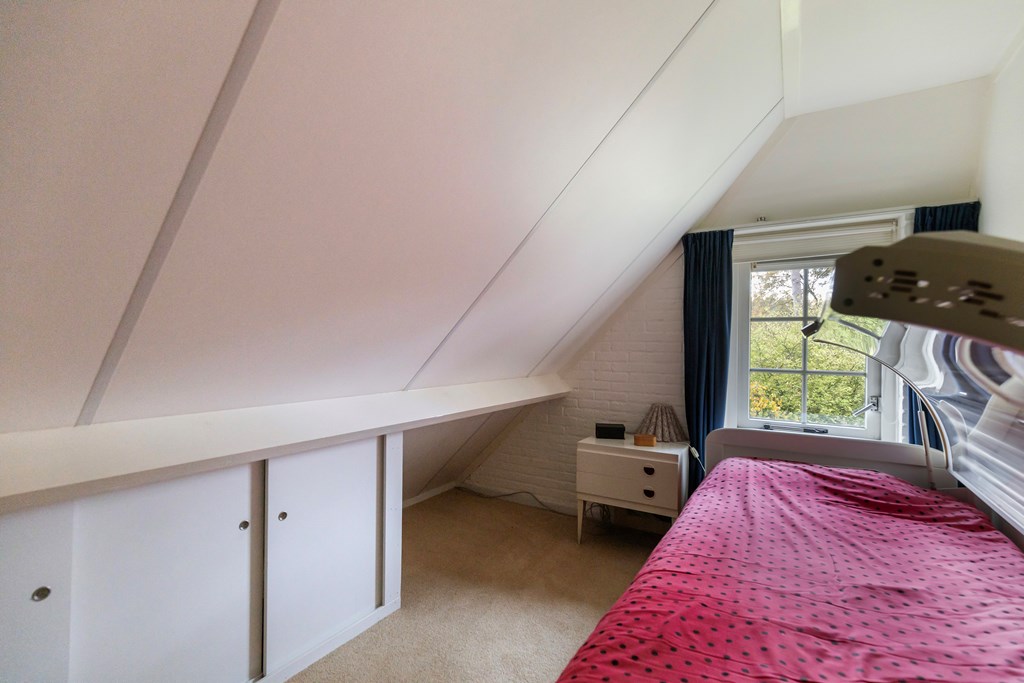 Overloop met toegang tot drie slaapkamers, een berging en de badkamer met bubbelbad, douche, wastafel en toilet. Beide slaapkamers aan de voorzijde en de slaapkamer aan de achterzijde zijn voorzien van dakkapellen.