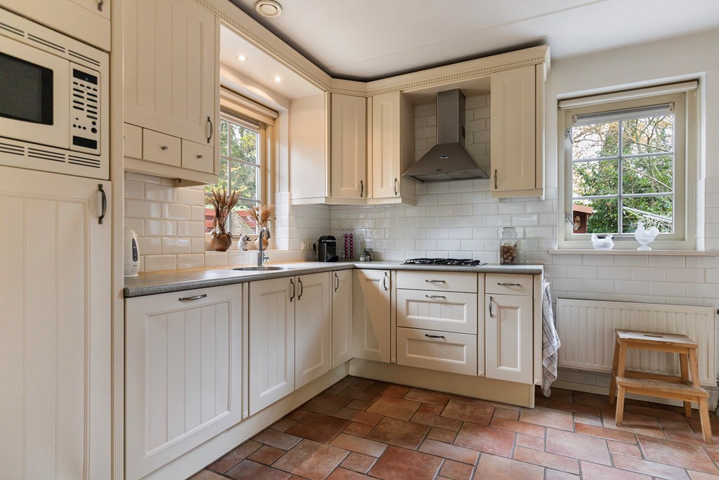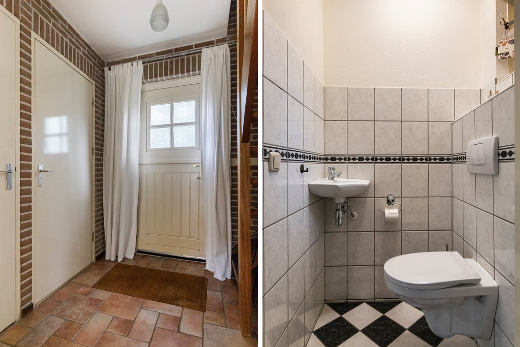Entree met hal, meterkast en toiletruimte. Vanuit de hal stap je de ruime, lichte woonkamer binnen met openslaande deuren naar het terras. De keuken bevindt zich aan de achterzijde van de woning en is uitgevoerd in een praktische hoekopstelling. Deze is uitgerust met een koelkast, vaatwasser, combimagnetron, gaskookplaat met afzuigkap. Ook is er via de keuken toegang tot de bijkeuken met aansluitingen voor witgoed. De begane grond is volledig voorzien van vloerverwarming, wat zorgt voor extra comfort.