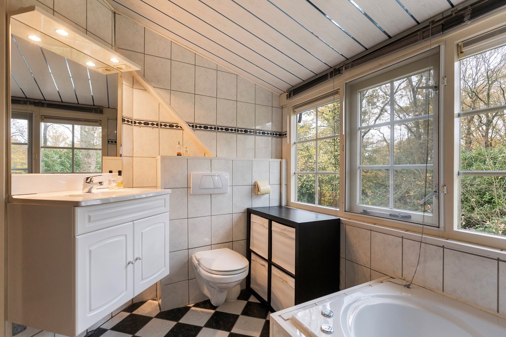 Overloop met toegang tot drie slaapkamers, een berging en de badkamer met bubbelbad, douche, wastafel en toilet. Beide slaapkamers aan de voorzijde en de slaapkamer aan de achterzijde zijn voorzien van dakkapellen.