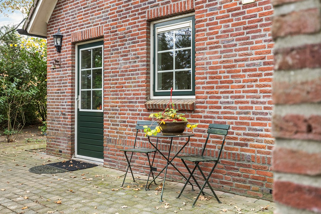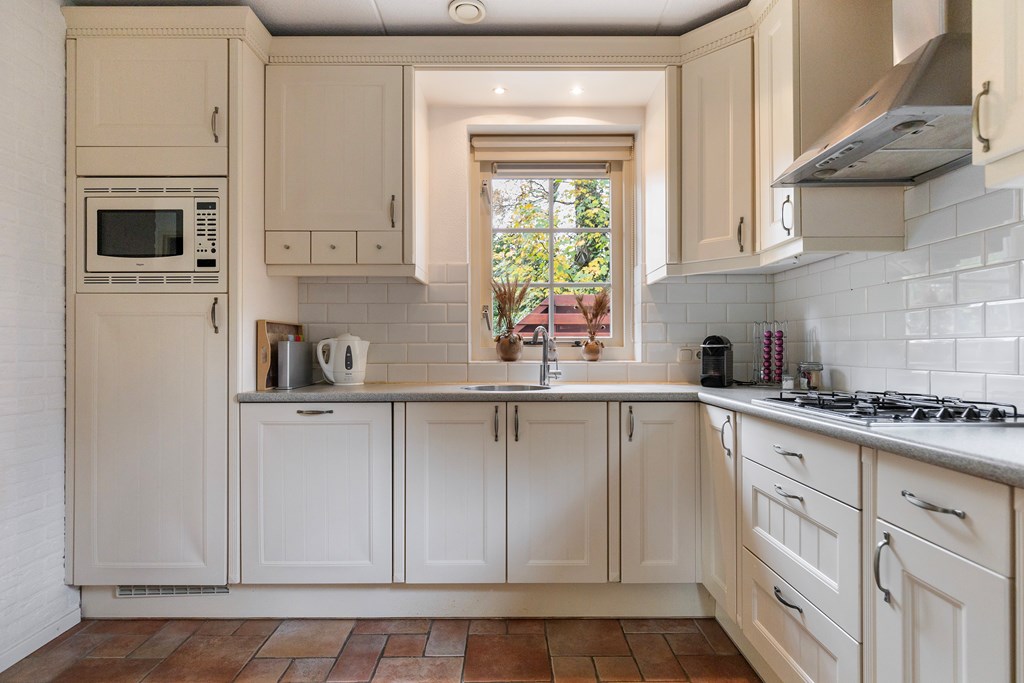 Entree met hal, meterkast en toiletruimte. Vanuit de hal stap je de ruime, lichte woonkamer binnen met openslaande deuren naar het terras. De keuken bevindt zich aan de achterzijde van de woning en is uitgevoerd in een praktische hoekopstelling. Deze is uitgerust met een koelkast, vaatwasser, combimagnetron, gaskookplaat met afzuigkap. Ook is er via de keuken toegang tot de bijkeuken met aansluitingen voor witgoed. De begane grond is volledig voorzien van vloerverwarming, wat zorgt voor extra comfort.