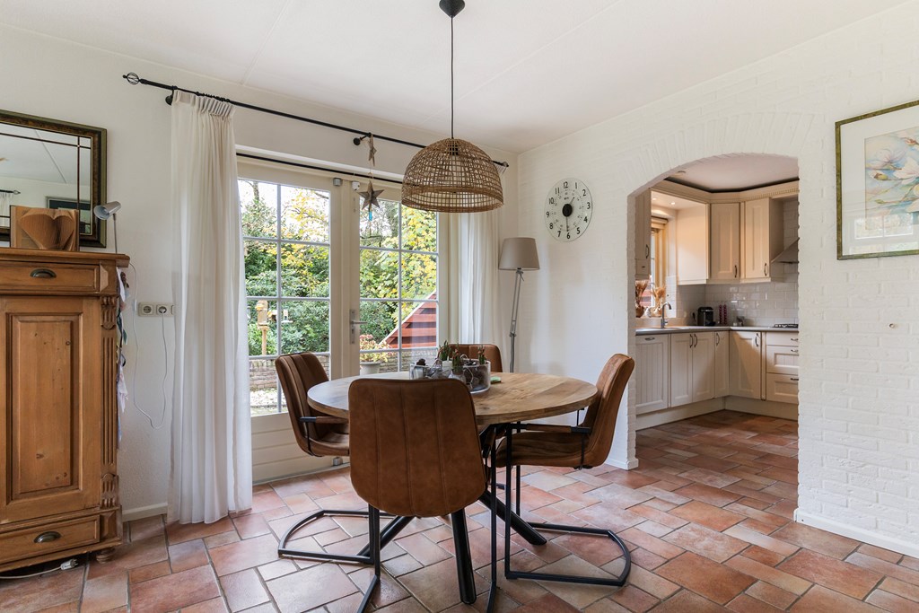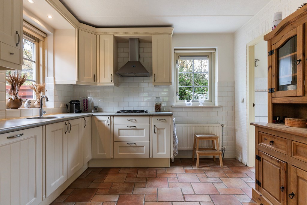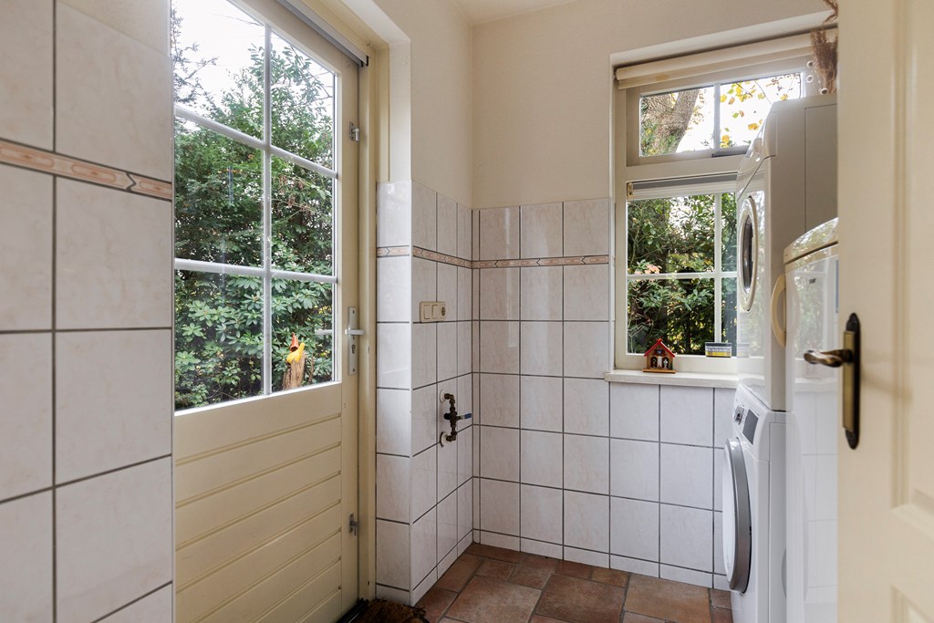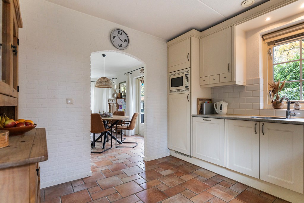 Entree met hal, meterkast en toiletruimte. Vanuit de hal stap je de ruime, lichte woonkamer binnen met openslaande deuren naar het terras. De keuken bevindt zich aan de achterzijde van de woning en is uitgevoerd in een praktische hoekopstelling. Deze is uitgerust met een koelkast, vaatwasser, combimagnetron, gaskookplaat met afzuigkap. Ook is er via de keuken toegang tot de bijkeuken met aansluitingen voor witgoed. De begane grond is volledig voorzien van vloerverwarming, wat zorgt voor extra comfort.