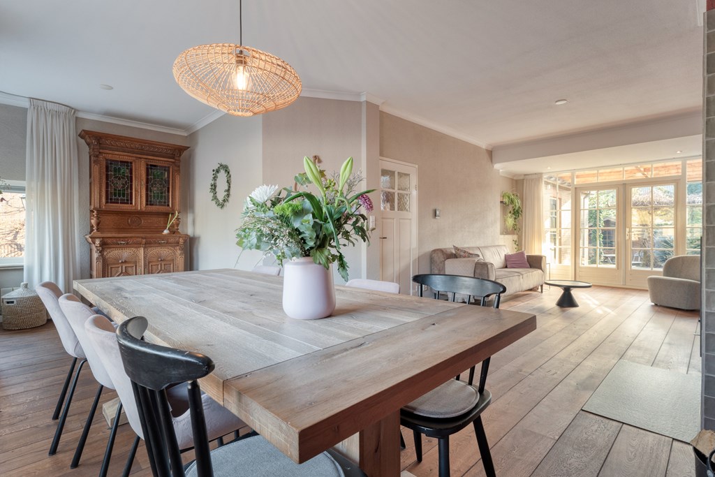 De entree/hal verwelkomt je met karaktervolle glas-in-loodramen en biedt toegang tot het toilet (2019), de meterkast, trapopgang en kelder. Vanuit de hal bereik je de keuken, die is uitgerust met SMEG-apparatuur (2020), waaronder een vaatwasser, gaskookplaat met afzuigkap, combimagnetron, oven en koelkast. De keuken staat in open verbinding met de bijkeuken, voorzien van witgoedaansluitingen en de cv-ketel. Vanuit de bijkeuken loop je zo de overkapping en de zonnige achtertuin in. De ruime en lichte woonkamer en eetkamer vormen samen een heerlijke leefruimte. De woonkamer is sfeervol ingericht met een houtkachel (2023), een massief houten vloer en openslaande deuren naar de achtertuin. Een fijne plek om te ontspannen én te genieten met vrienden en familie.