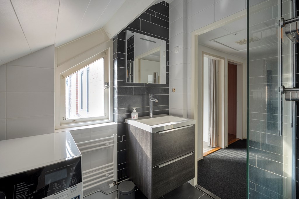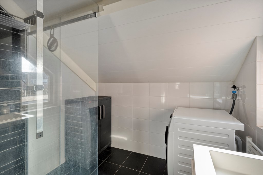 Overloop met toegang tot drie slaapkamers, waaronder een ruime hoofdslaapkamer. De badkamer is voorzien van een inloopdouche, wastafel, toilet en witgoedaansluiting. Daarnaast is er een vaste kast voor extra bergruimte.