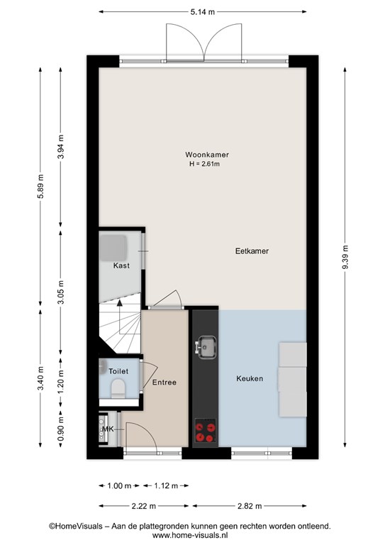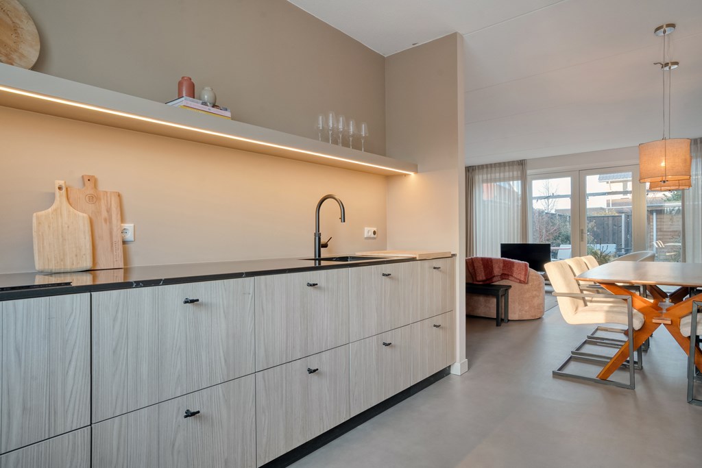 Via de voortuin bereik je de voordeur en kom je binnen in de hal met modern toilet, meterkast en trapopgang. Vanuit de hal loop je zo de ruime, tuingerichte woonkamer in. Deze is tijdens de bouw 1,20 meter uitgebouwd en voorzien van veel glas met openslaande tuindeuren naar de achtertuin, wat zorgt voor veel licht en een prettige verbinding met buiten. De keuken bevindt zich aan de voorzijde van de woning, is uitgevoerd in een moderne opstelling en beschikt uiteraard over alle kwaliteit inbouwapparatuur; zoals een vaatwasser (2026), Quooker, koelkast, oven en inductiekookplaat. Op de volledige begane grond ligt een vloer van marmoleum.