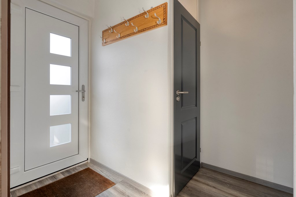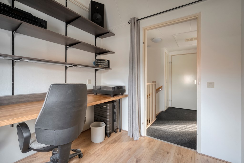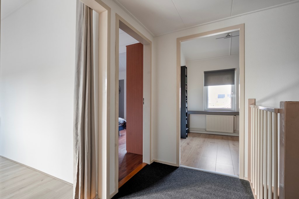 Overloop met toegang tot drie slaapkamers, waaronder een ruime hoofdslaapkamer. De badkamer is voorzien van een inloopdouche, wastafel, toilet en witgoedaansluiting. Daarnaast is er een vaste kast voor extra bergruimte.