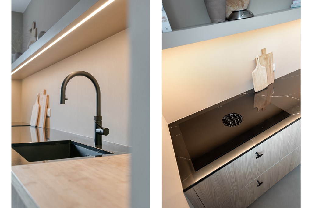 Via de voortuin bereik je de voordeur en kom je binnen in de hal met modern toilet, meterkast en trapopgang. Vanuit de hal loop je zo de ruime, tuingerichte woonkamer in. Deze is tijdens de bouw 1,20 meter uitgebouwd en voorzien van veel glas met openslaande tuindeuren naar de achtertuin, wat zorgt voor veel licht en een prettige verbinding met buiten. De keuken bevindt zich aan de voorzijde van de woning, is uitgevoerd in een moderne opstelling en beschikt uiteraard over alle kwaliteit inbouwapparatuur; zoals een vaatwasser (2026), Quooker, koelkast, oven en inductiekookplaat. Op de volledige begane grond ligt een vloer van marmoleum.