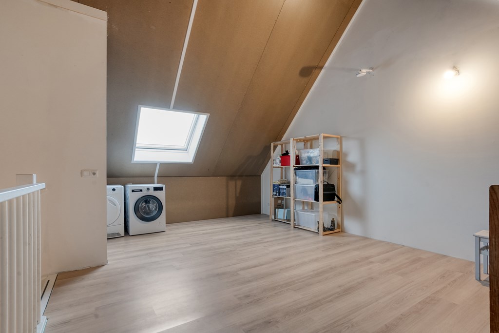 De zolderverdieping is opvallend ruim en heeft momenteel een open indeling, waardoor deze verdieping nog geheel naar eigen wens kan worden ingericht. Hier bevinden zich tevens de witgoedaansluitingen, de elektrische boiler en de MV-installatie.