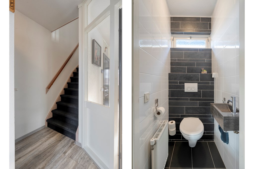 Entree met garderoberuimte en toegang tot het toilet, de trapopgang en de leefruimte. Het toilet is voorzien van een fonteintje. De woonkamer met zithoek staat in open verbinding met de eetkamer. De open keuken beschikt over een oven, inductie kookplaat, afzuigkap en koelkast. Aansluitend bevindt zich een provisiekast.