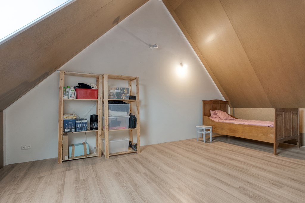 De zolderverdieping is opvallend ruim en heeft momenteel een open indeling, waardoor deze verdieping nog geheel naar eigen wens kan worden ingericht. Hier bevinden zich tevens de witgoedaansluitingen, de elektrische boiler en de MV-installatie.