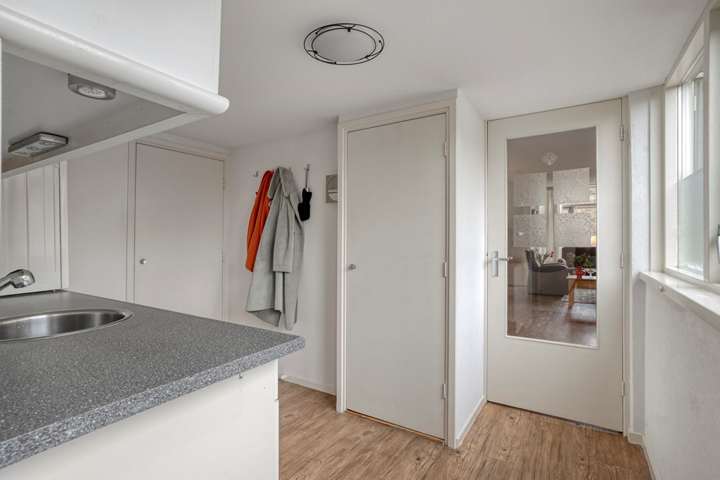 Entree/hal met meterkast en toiletruimte voorzien van toilet en fonteintje. Aan de voorzijde bevindt zich een slaapkamer. Aan de achterzijde van de woning bevindt zich de masterbedroom met aangrenzend een doucheruimte en een deur naar de tuin. De ruime woonkamer biedt een comfortabel zit- en eetgedeelte. De woonkamer staat in open verbinding met de keuken aan de achterzijde, welke is voorzien van inbouwapparatuur, waaronder een gaskookplaat, afzuigkap, koelkast en combimagnetron. Vanuit de keuken is de bijkeuken bereikbaar met opstelplaats voor de cv-installatie, witgoedaansluitingen en een extra keukenblok met wasbak. Tevens is vanuit hier de opbergkelder bereikbaar. Aansluitend bevinden zich de badkamer met douche en wastafel en een separaat toilet. De woonkamer, keuken en bijkeuken zijn voorzien van vloerverwarming, de badkamer beschikt over elektrische vloerverwarming.