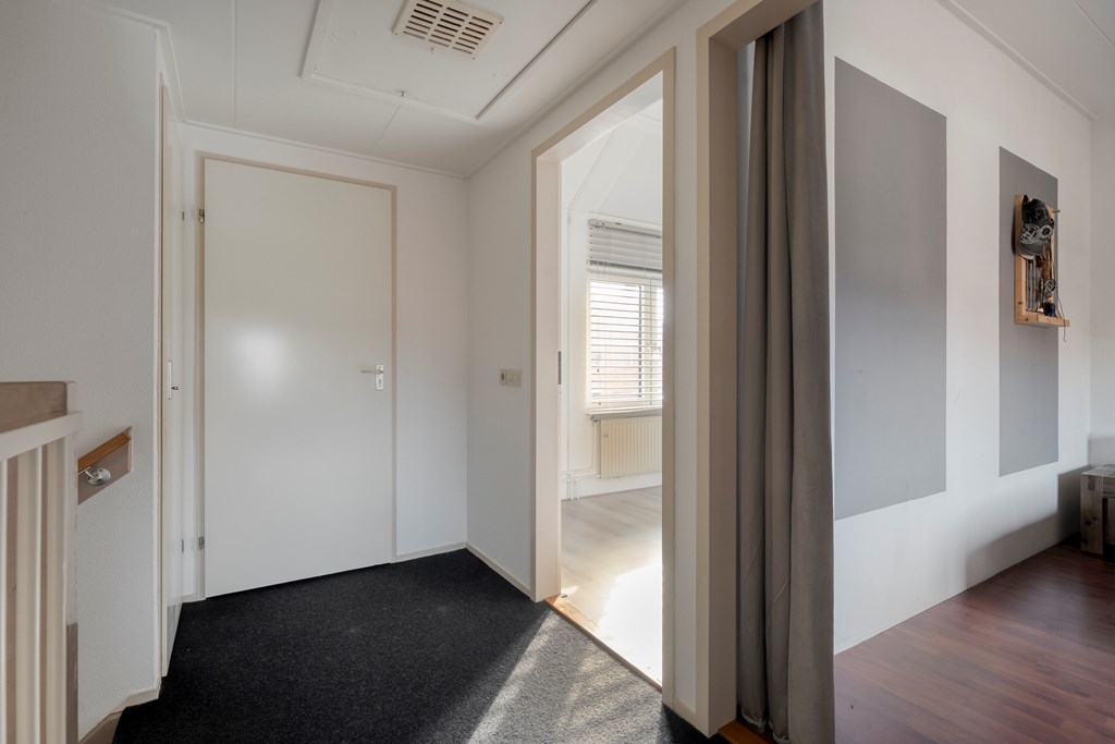 Overloop met toegang tot drie slaapkamers, waaronder een ruime hoofdslaapkamer. De badkamer is voorzien van een inloopdouche, wastafel, toilet en witgoedaansluiting. Daarnaast is er een vaste kast voor extra bergruimte.