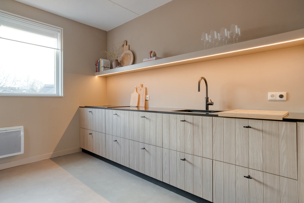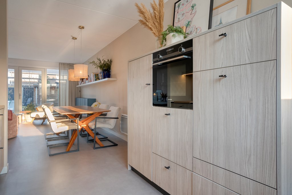 Via de voortuin bereik je de voordeur en kom je binnen in de hal met modern toilet, meterkast en trapopgang. Vanuit de hal loop je zo de ruime, tuingerichte woonkamer in. Deze is tijdens de bouw 1,20 meter uitgebouwd en voorzien van veel glas met openslaande tuindeuren naar de achtertuin, wat zorgt voor veel licht en een prettige verbinding met buiten. De keuken bevindt zich aan de voorzijde van de woning, is uitgevoerd in een moderne opstelling en beschikt uiteraard over alle kwaliteit inbouwapparatuur; zoals een vaatwasser (2026), Quooker, koelkast, oven en inductiekookplaat. Op de volledige begane grond ligt een vloer van marmoleum.