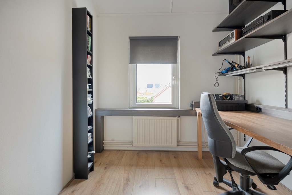 Overloop met toegang tot drie slaapkamers, waaronder een ruime hoofdslaapkamer. De badkamer is voorzien van een inloopdouche, wastafel, toilet en witgoedaansluiting. Daarnaast is er een vaste kast voor extra bergruimte.