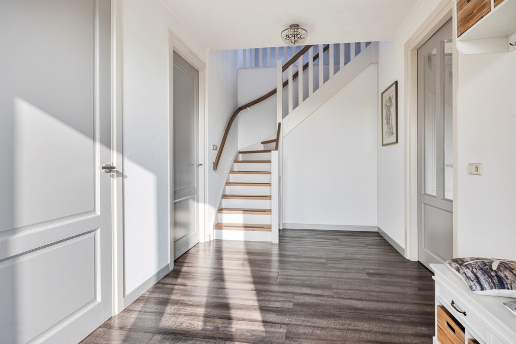 Entree/meterkast/ wandtoilet met fontein/ kantoor cq. bijkamer/ achteringang/ bijkeuken voorzien van wasmachineaansluiting en een extra aanrechtblok met spoelbak/ halfopen keuken voorzien van anderhalf spoelbak, 5-pits inductiekookplaat, vlakschermafzuigkap, combimagnetron, koelkast, vriezer en vaatwasmachine/ woonkamer voor-zien van gashaard, schuifpui naar terras/ slaapkamer met schuifpui en inloopkast/ badkamer voorzien van douchehoek, vaste wastafel, wandtoilet met designradiator.