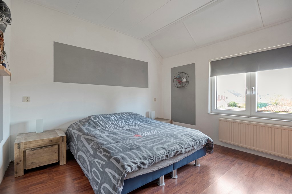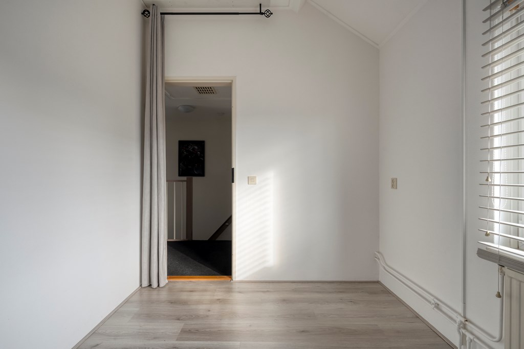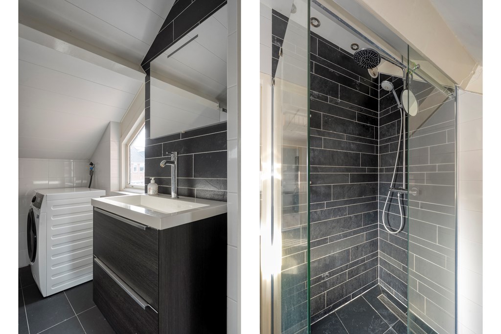 Overloop met toegang tot drie slaapkamers, waaronder een ruime hoofdslaapkamer. De badkamer is voorzien van een inloopdouche, wastafel, toilet en witgoedaansluiting. Daarnaast is er een vaste kast voor extra bergruimte.
