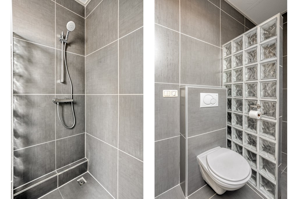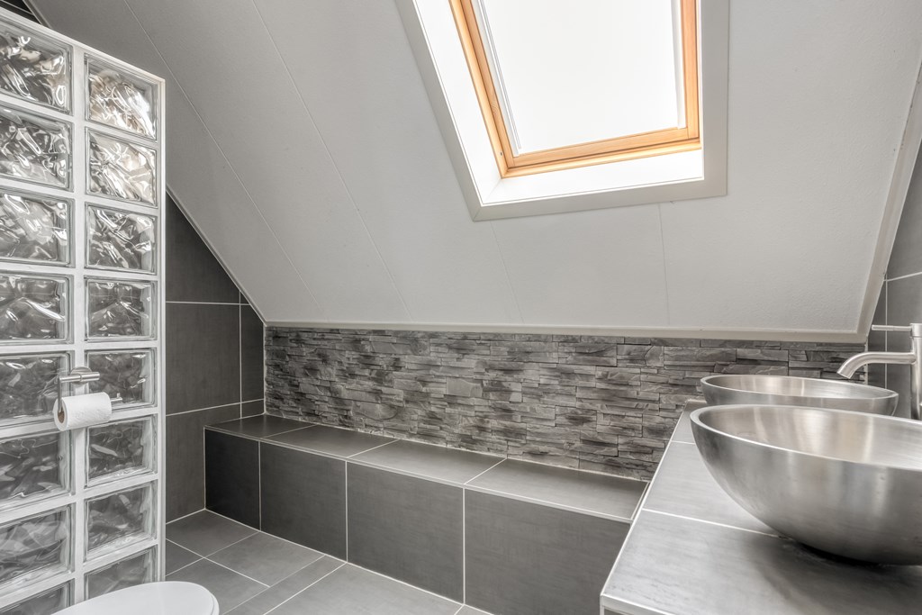 Overloop met toegang tot drie slaapkamers, waarvan 1 met dakkapel en de badkamer met douche, wastafelmeubel met dubbele waskom en vrijhangend toilet.