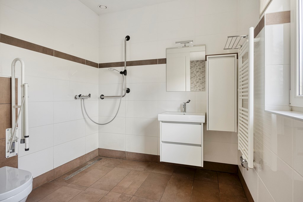 Entree/meterkast/ wandtoilet met fontein/ kantoor cq. bijkamer/ achteringang/ bijkeuken voorzien van wasmachineaansluiting en een extra aanrechtblok met spoelbak/ halfopen keuken voorzien van anderhalf spoelbak, 5-pits inductiekookplaat, vlakschermafzuigkap, combimagnetron, koelkast, vriezer en vaatwasmachine/ woonkamer voor-zien van gashaard, schuifpui naar terras/ slaapkamer met schuifpui en inloopkast/ badkamer voorzien van douchehoek, vaste wastafel, wandtoilet met designradiator.