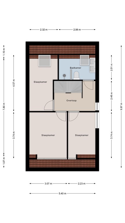 Overloop met toegang tot drie slaapkamers, waarvan 1 met dakkapel en de badkamer met douche, wastafelmeubel met dubbele waskom en vrijhangend toilet.