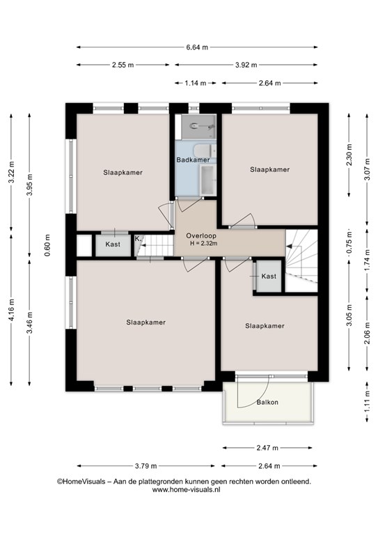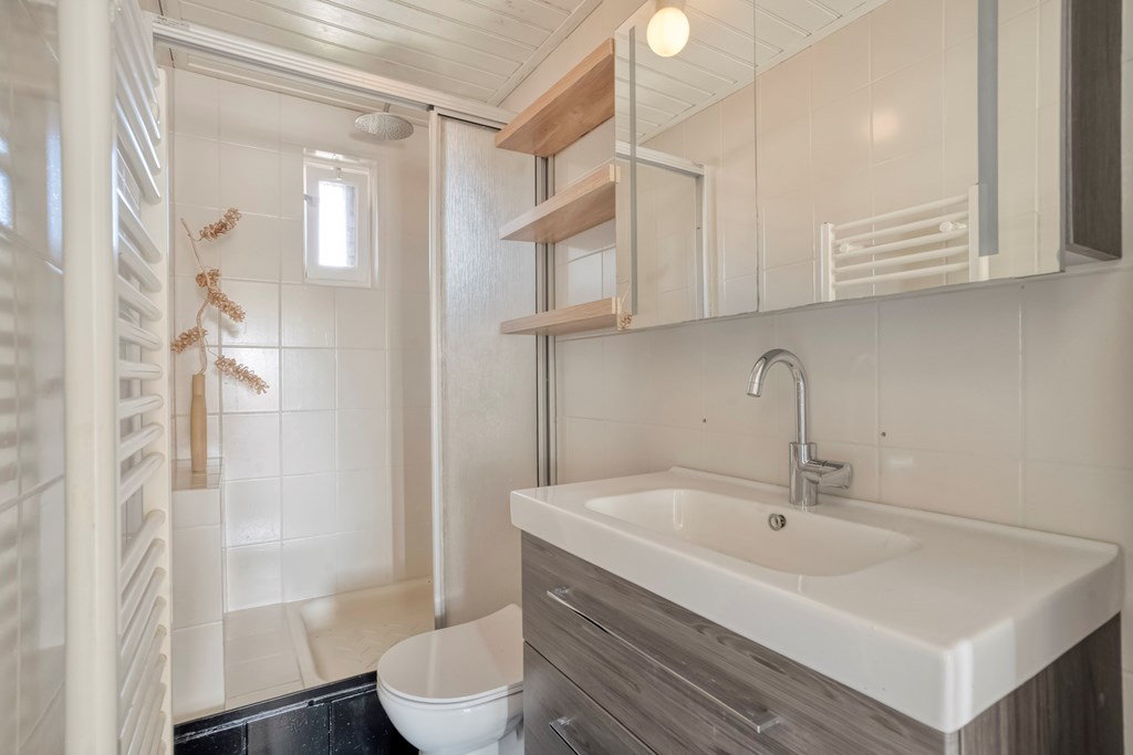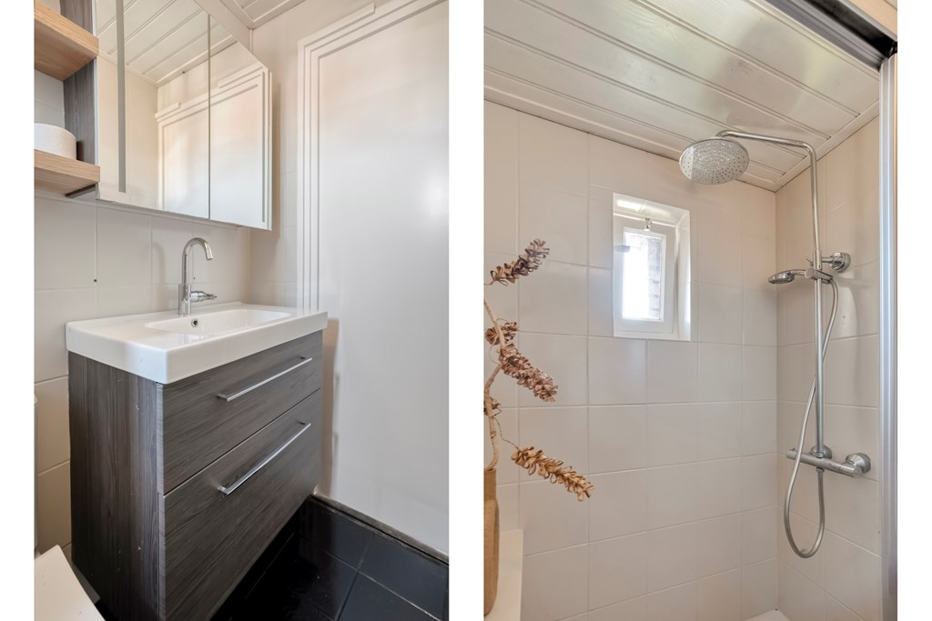 Overloop met toegang tot vier slaapkamers en de badkamer. De badkamer is voorzien van een douche en wastafel. Eén van de slaapkamers biedt toegang tot het balkon.