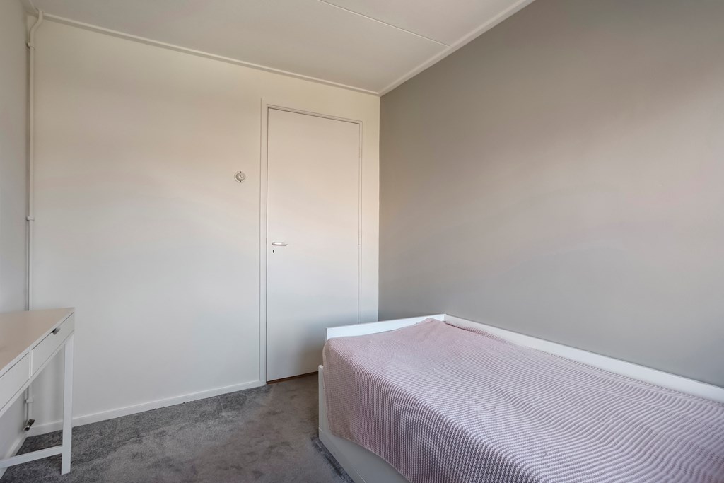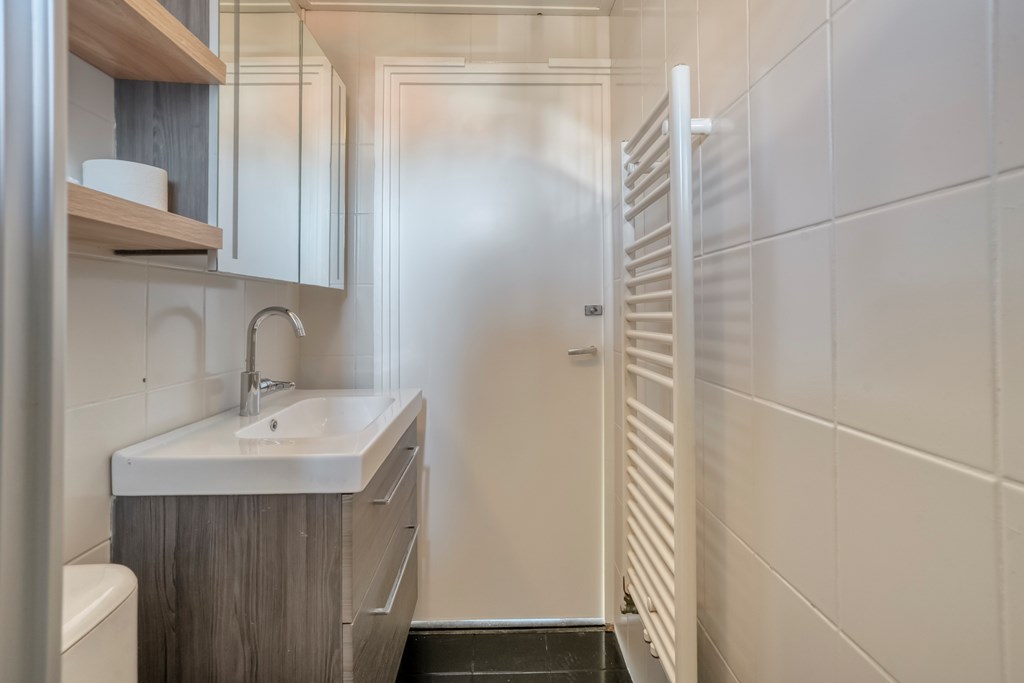 Overloop met toegang tot vier slaapkamers en de badkamer. De badkamer is voorzien van een douche en wastafel. Eén van de slaapkamers biedt toegang tot het balkon.