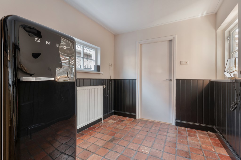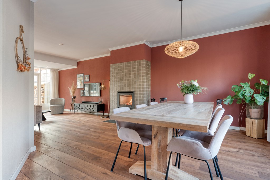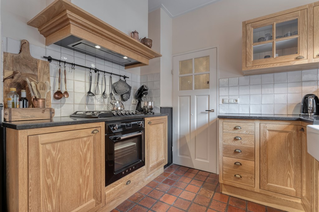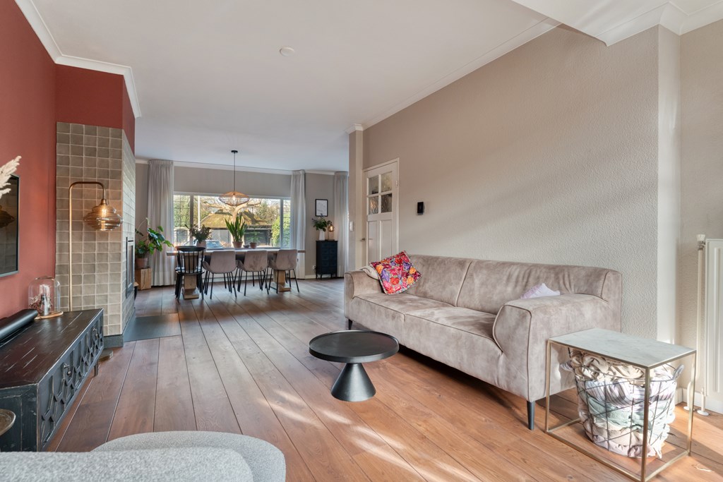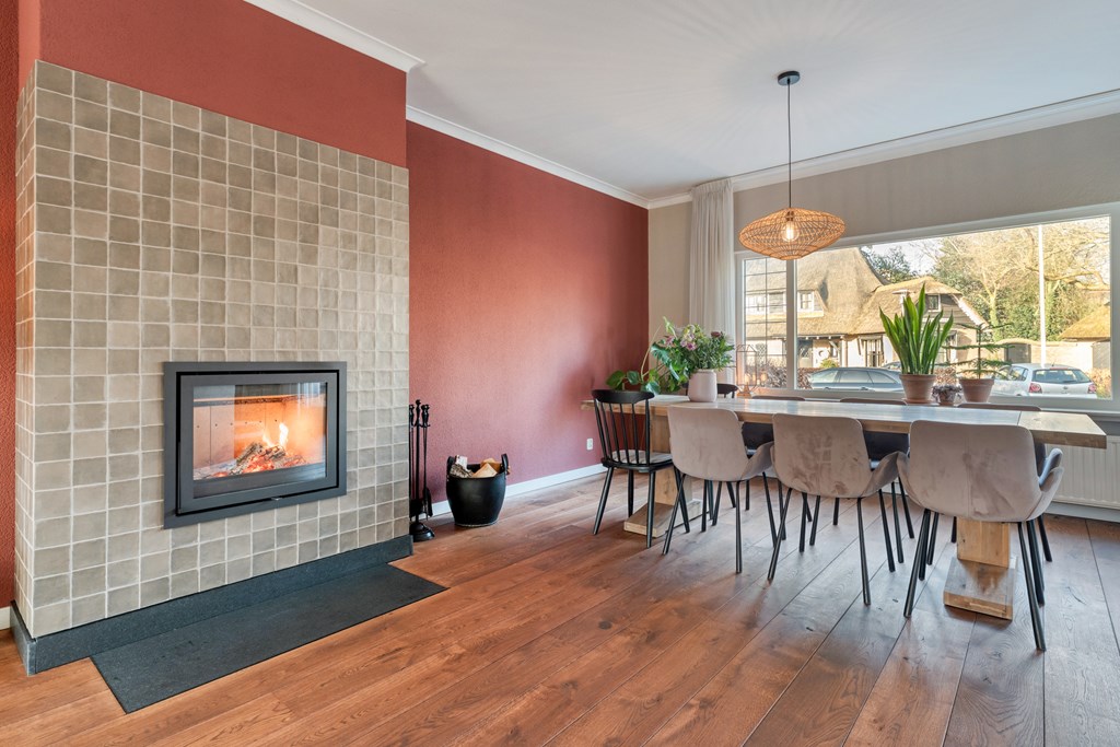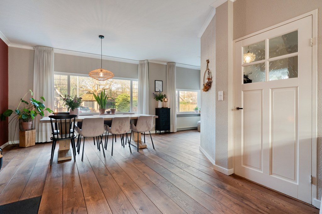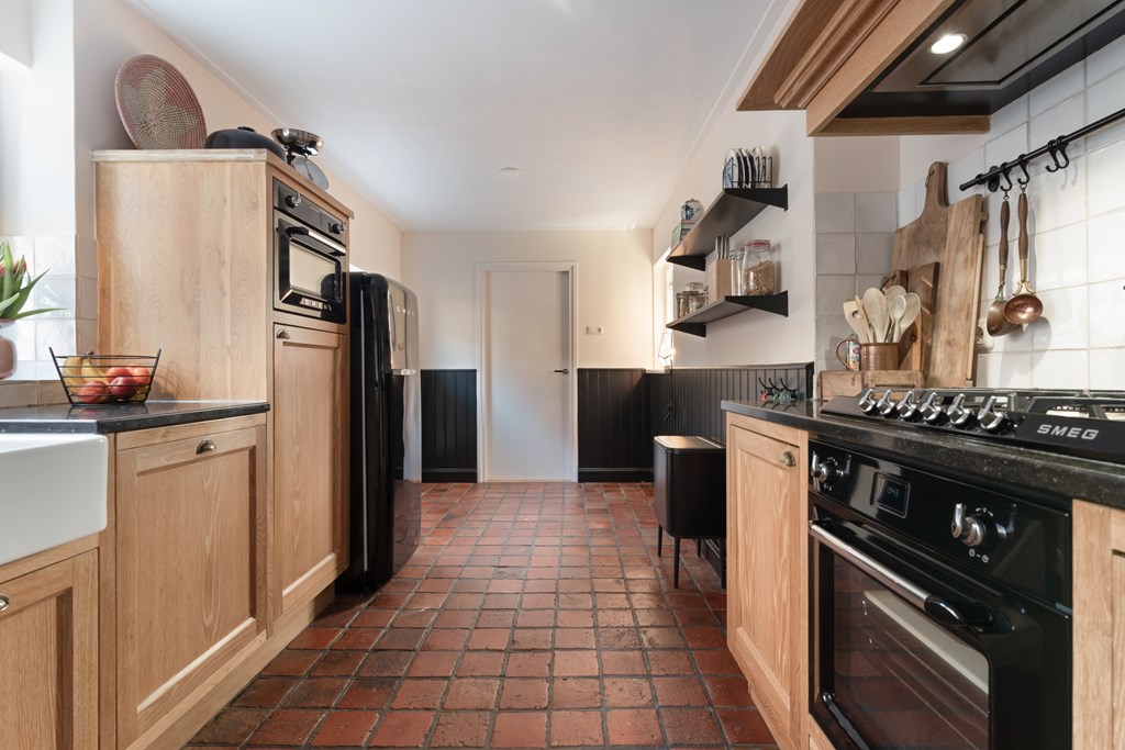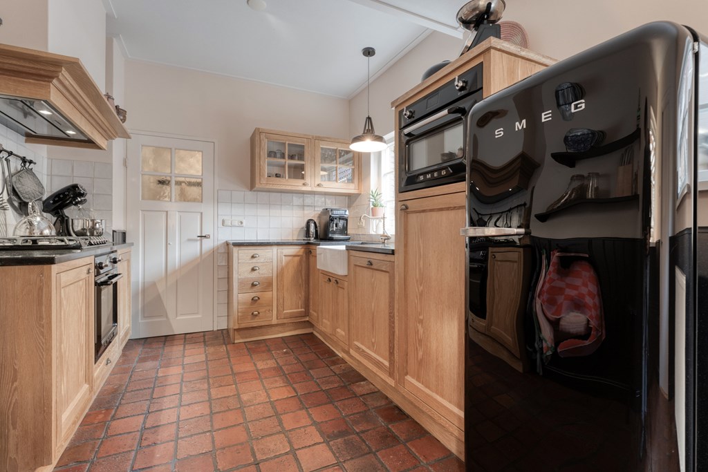 De entree/hal verwelkomt je met karaktervolle glas-in-loodramen en biedt toegang tot het toilet (2019), de meterkast, trapopgang en kelder. Vanuit de hal bereik je de keuken, die is uitgerust met SMEG-apparatuur (2020), waaronder een vaatwasser, gaskookplaat met afzuigkap, combimagnetron, oven en koelkast. De keuken staat in open verbinding met de bijkeuken, voorzien van witgoedaansluitingen en de cv-ketel. Vanuit de bijkeuken loop je zo de overkapping en de zonnige achtertuin in. De ruime en lichte woonkamer en eetkamer vormen samen een heerlijke leefruimte. De woonkamer is sfeervol ingericht met een houtkachel (2023), een massief houten vloer en openslaande deuren naar de achtertuin. Een fijne plek om te ontspannen én te genieten met vrienden en familie.