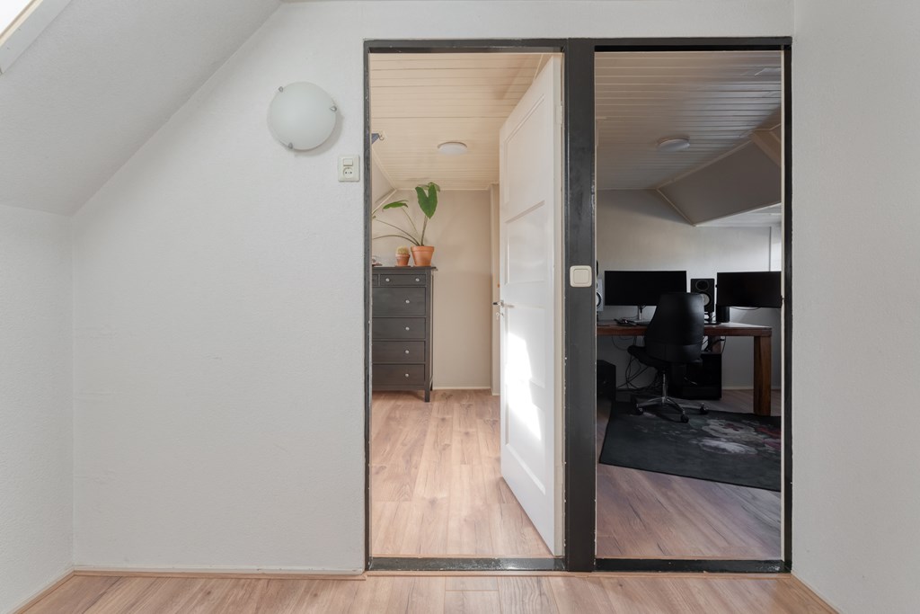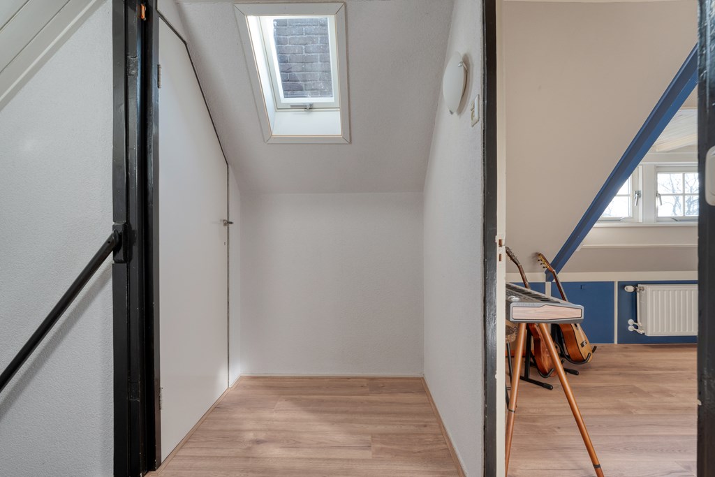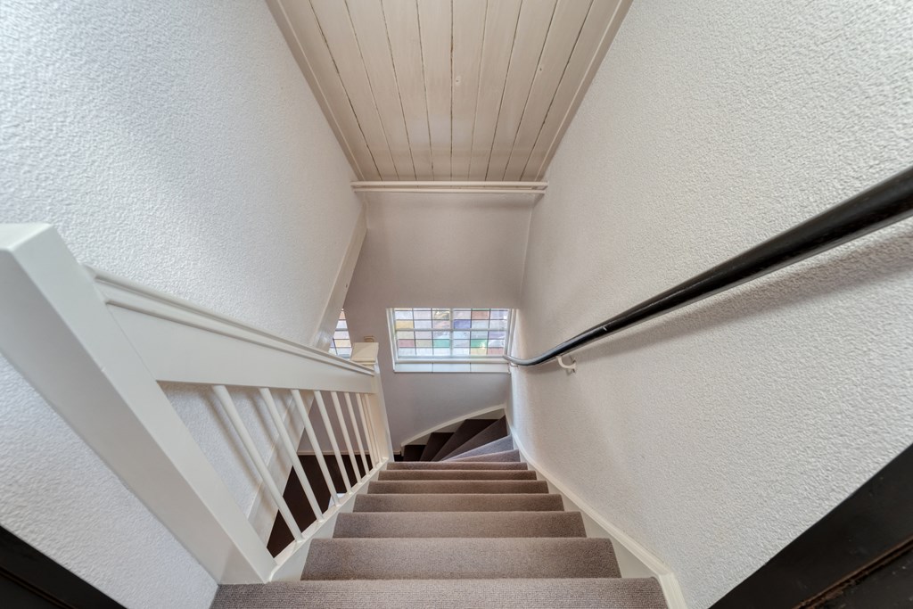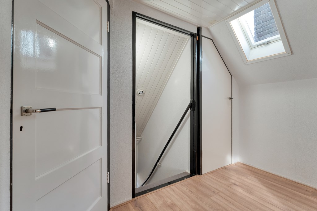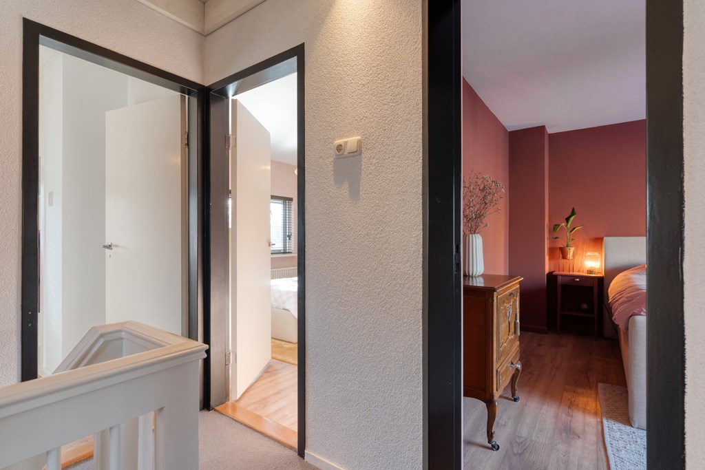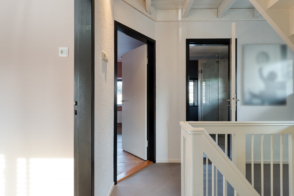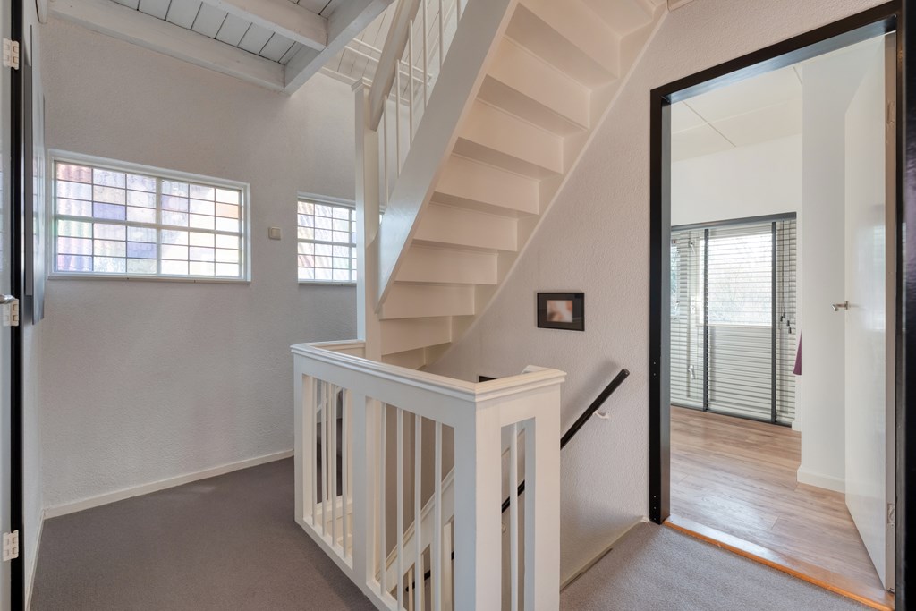 Vaste trap naar de tweede verdieping. Overloop met toegang tot twee slaapkamers en twee bergingen, ideaal voor extra opslagruimte.