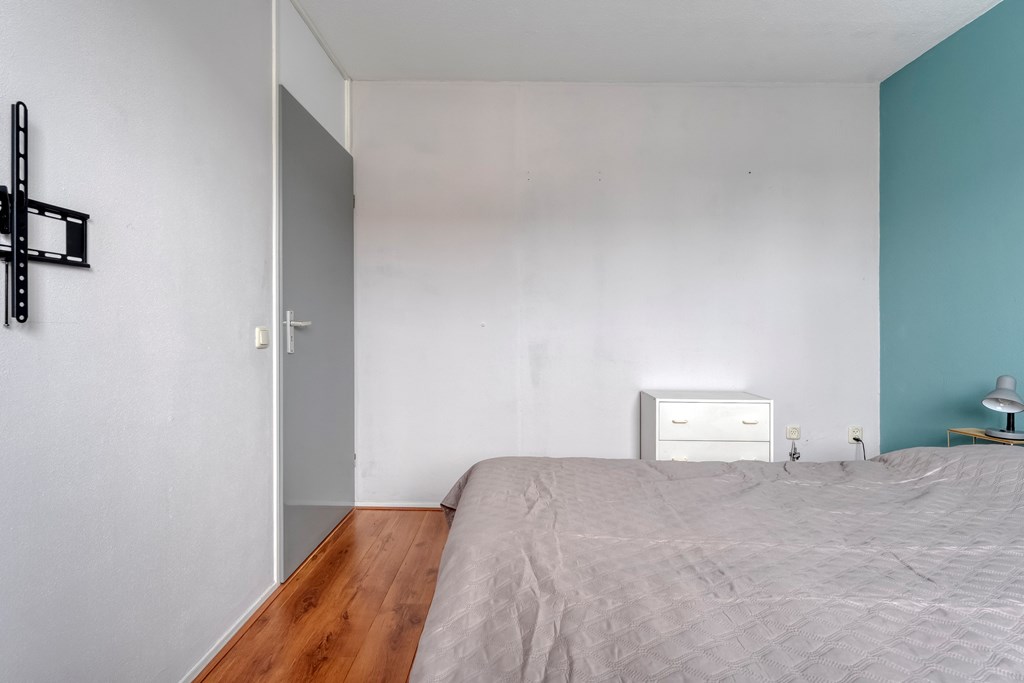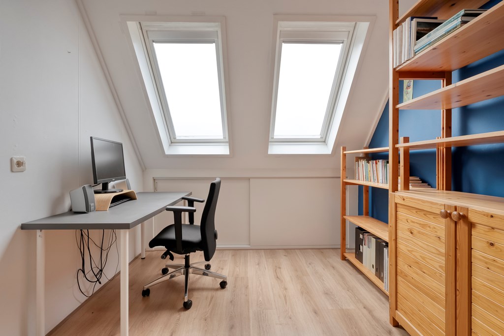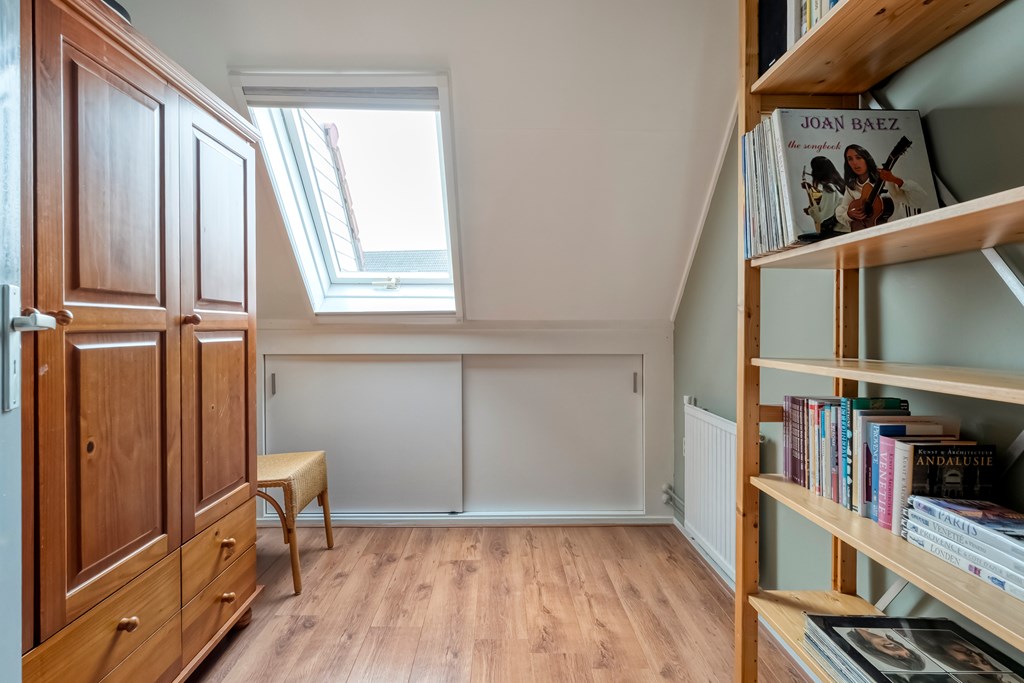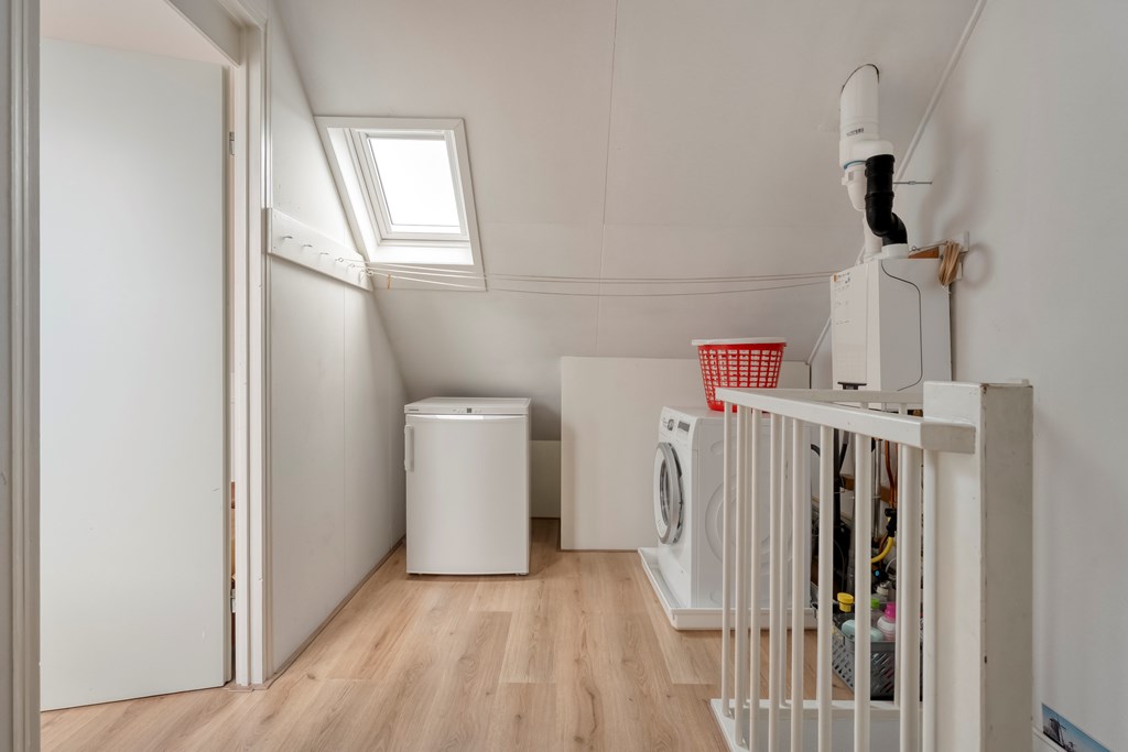 Via een vaste trap bereik je de tweede verdieping. Op de overloop bevindt zich de witgoedaansluiting en is er toegang tot een extra slaap- of werkkamer. Achter de knieschotten is bovendien praktische bergruimte aanwezig.
