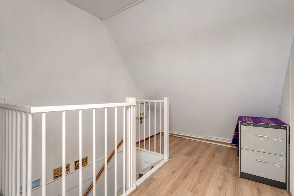 Via een vaste trap bereik je de tweede verdieping. Op de overloop bevindt zich de witgoedaansluiting en is er toegang tot een extra slaap- of werkkamer. Achter de knieschotten is bovendien praktische bergruimte aanwezig.