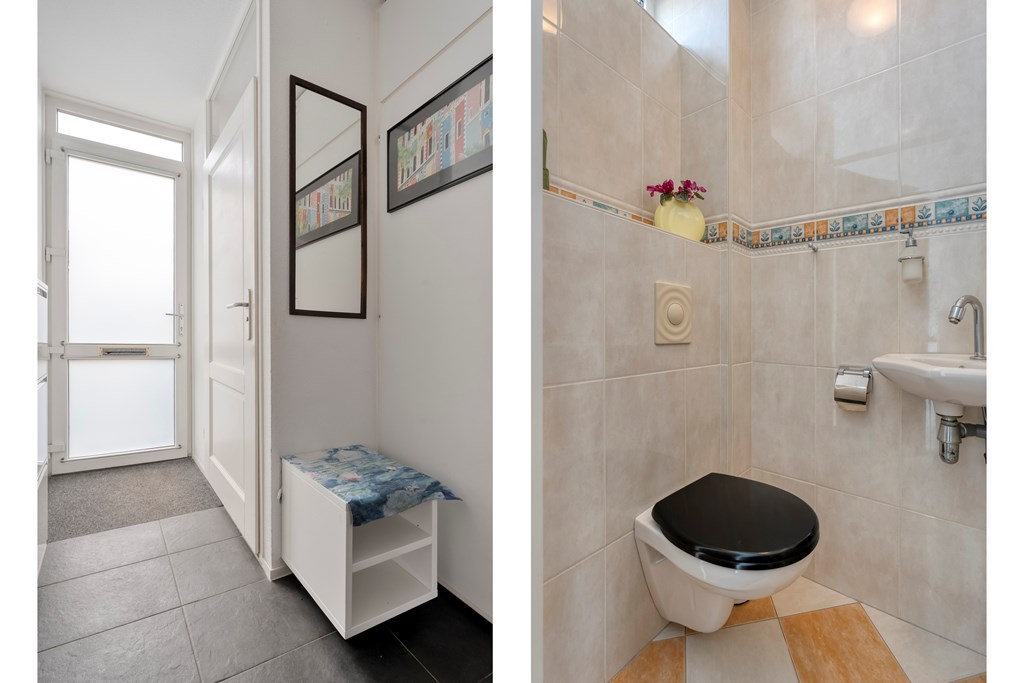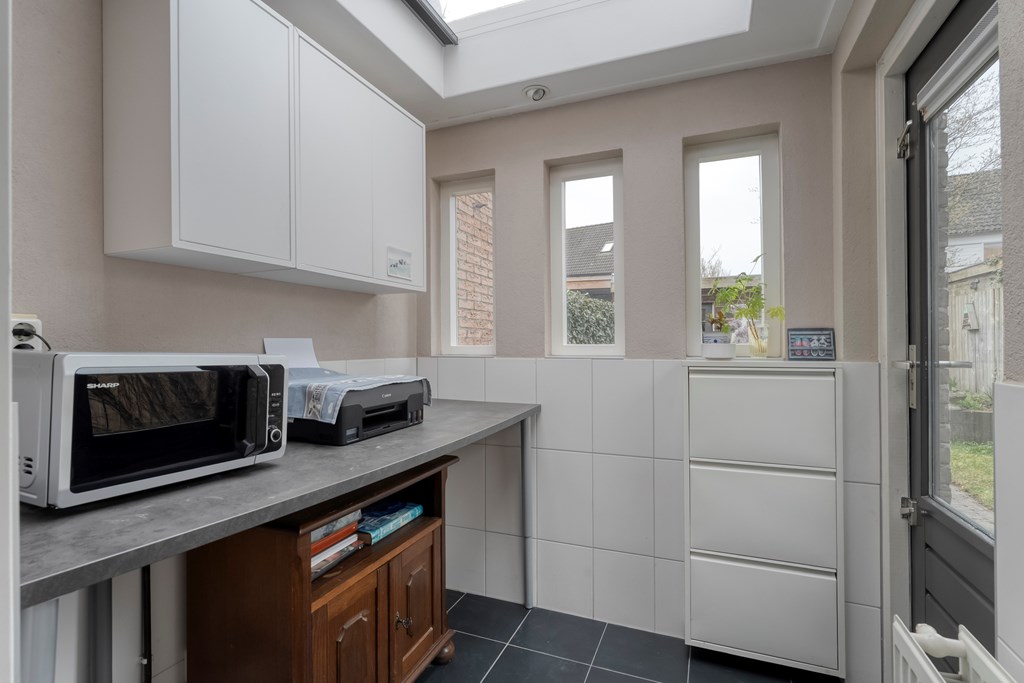 Voor de woning is volop parkeergelegenheid aanwezig. Entree in de hal met toilet en meterkast. De keuken bevindt zich aan de voorzijde en is voorzien van diverse inbouwapparatuur, waaronder een inductiekookplaat, afzuigkap, vaatwasser, koelkast met vriesvak en een oven. Aan de achterzijde vind je de ruime en lichte woonkamer met een warme houten vloer en veel natuurlijk daglicht. Vanuit hier heb je toegang tot de praktische bijkeuken met lichtkoepel, witgoedaansluiting en directe doorgang naar de zonnige tuin op het zuiden.